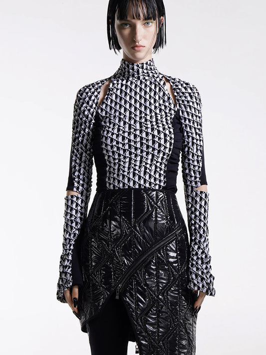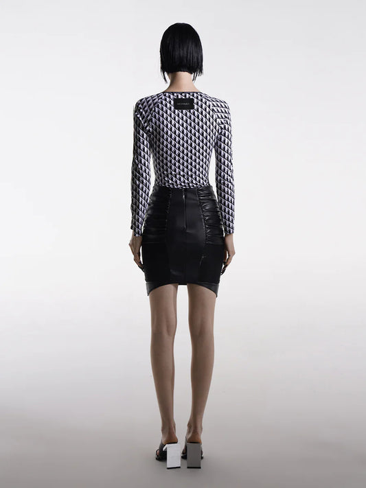 PRINTED GATHERED LONG SLEEVES TOP WITH CUT-OUT DETAIL