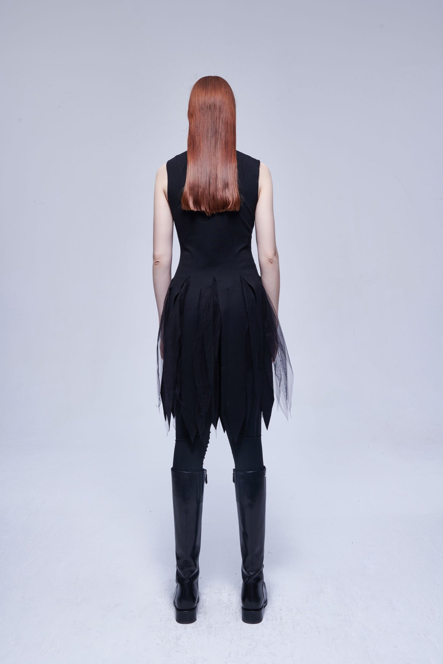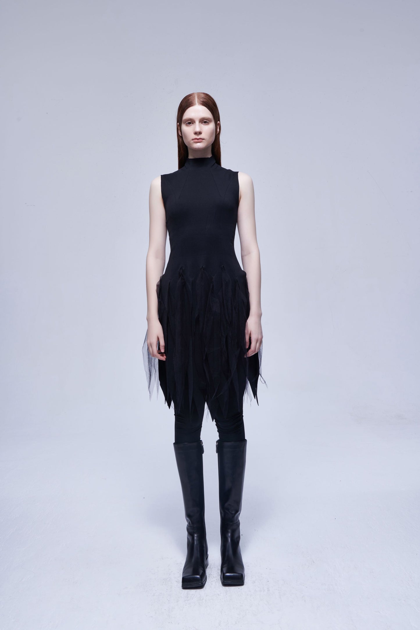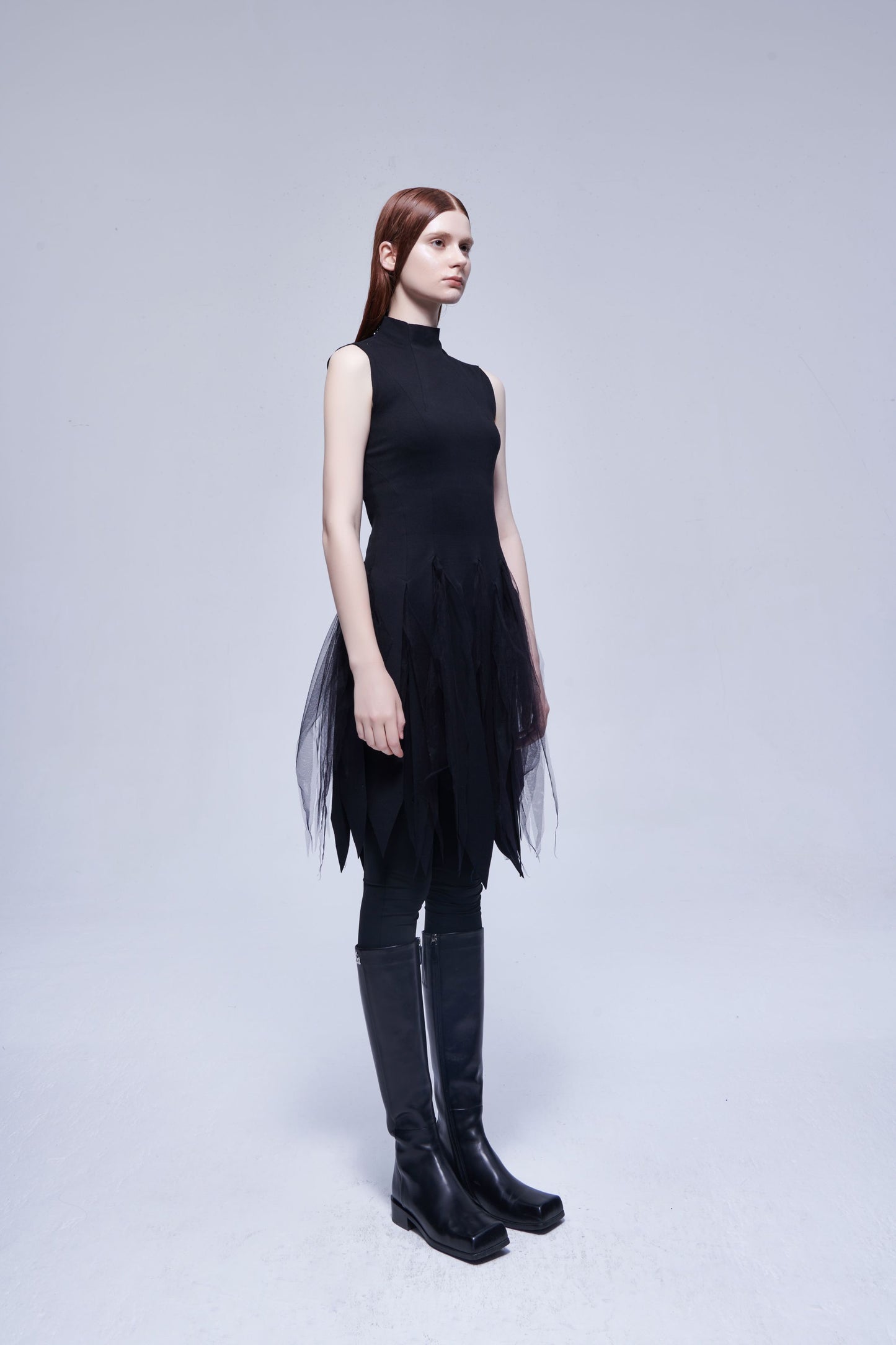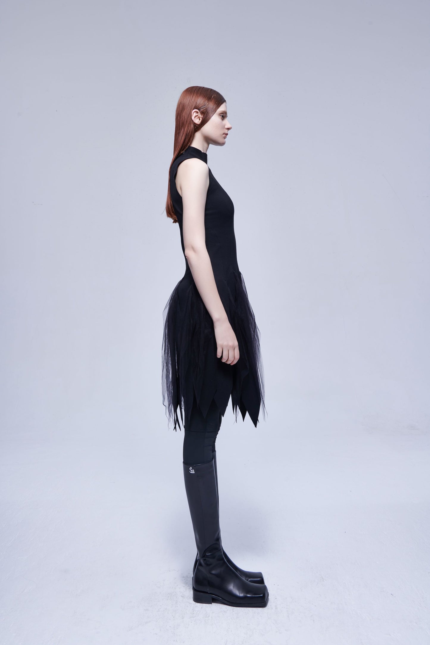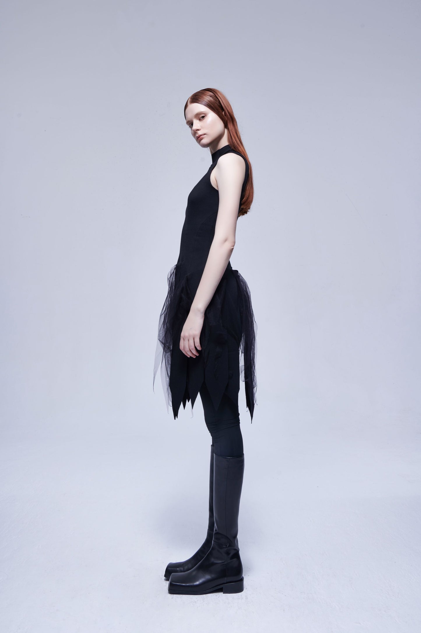This dress features a spliced mesh design, which adds delicacy to the skirt. The asymmetrical hem breaks the convention and creates a unique and delicate look.