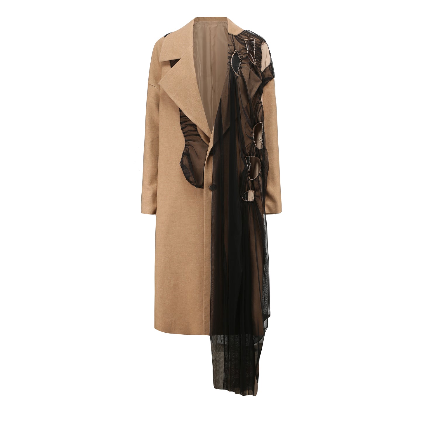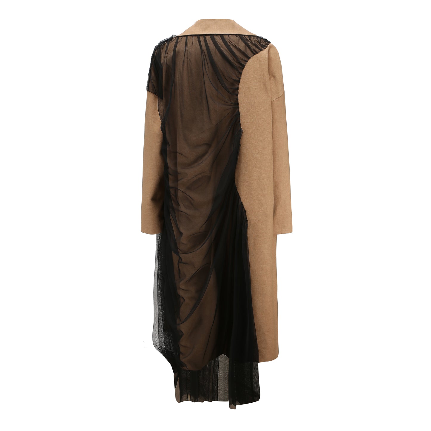 Loose-fitting trench coat with a large shawl collar and hollow-out details created by hand-cut and sewn pleated gauze, attempting to capture light and airy dreams. The black gauze naturally hangs down, and the tie can be freely adjusted to create an irregular contour that simulates the body floating on the water surface.