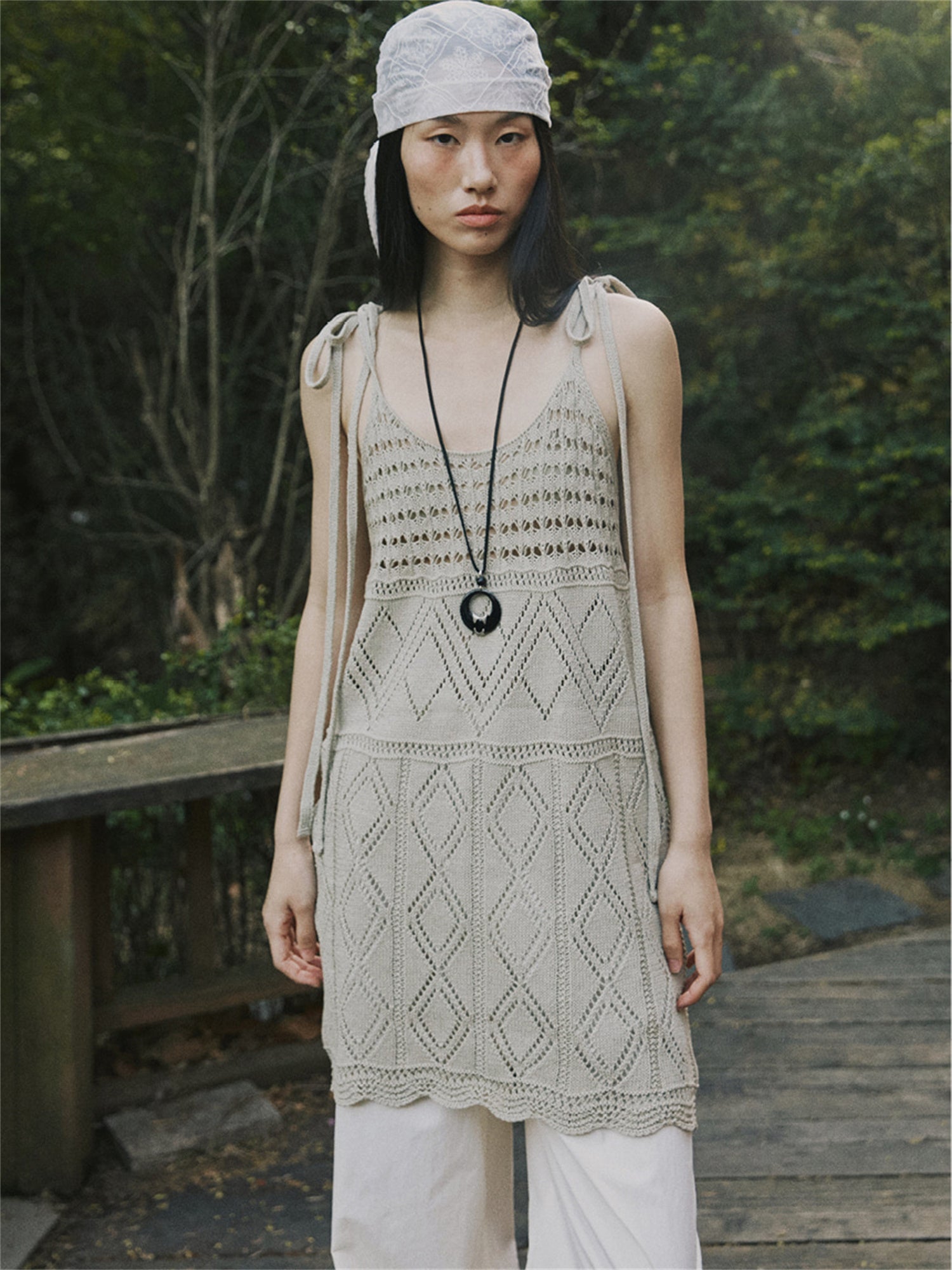 This slim, no-collar vest features a modern feel. The shallow neckline offers a comfortable fit and allows for natural movement even when worn alone. Natural horn buttons add a touch of refined sophistication. A thin belt from the same fabric allows for a variety of silhouettes, creating an elegant look that flows naturally with the wearer's movements.