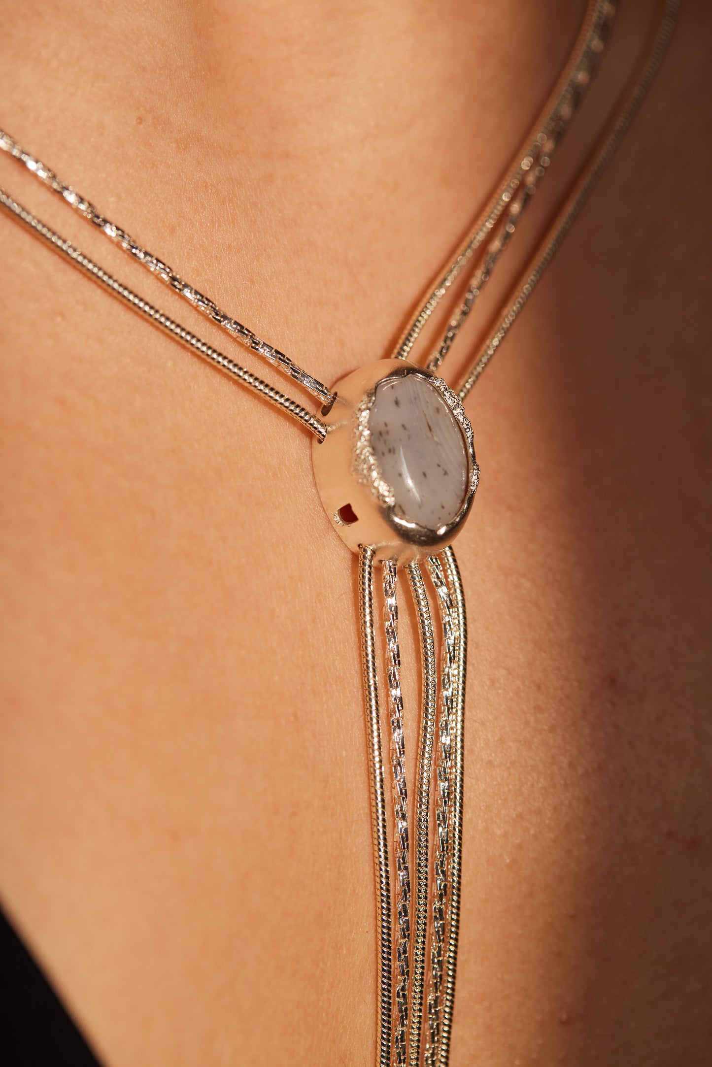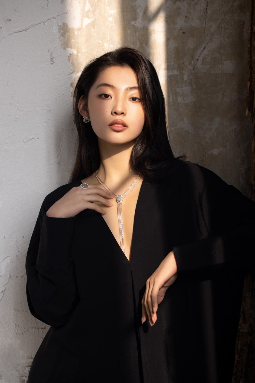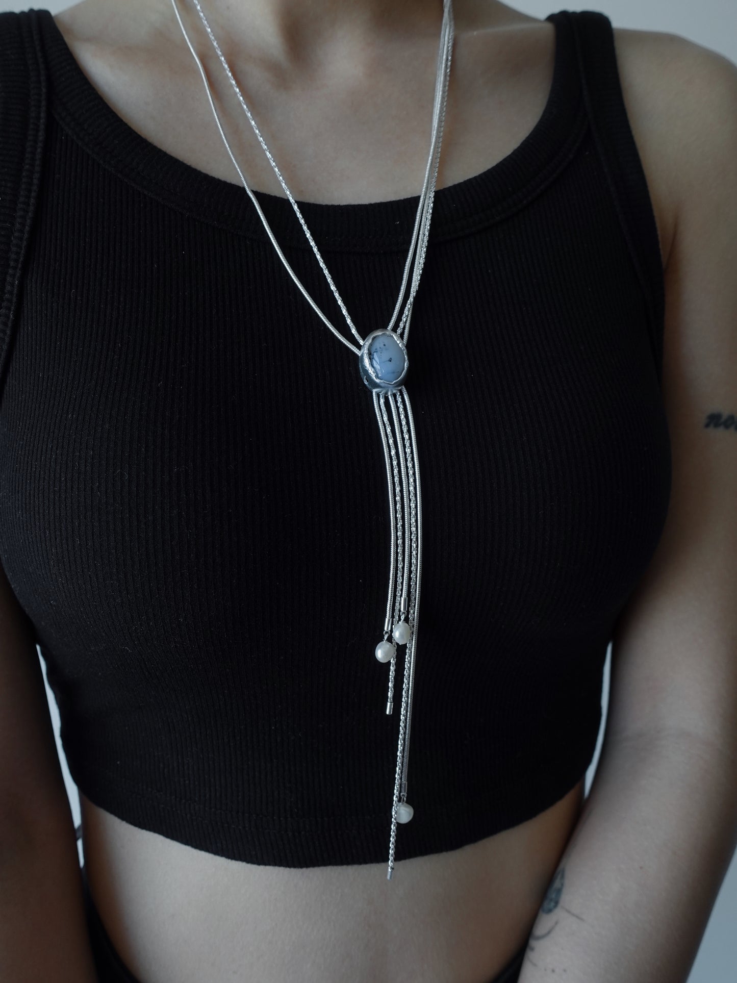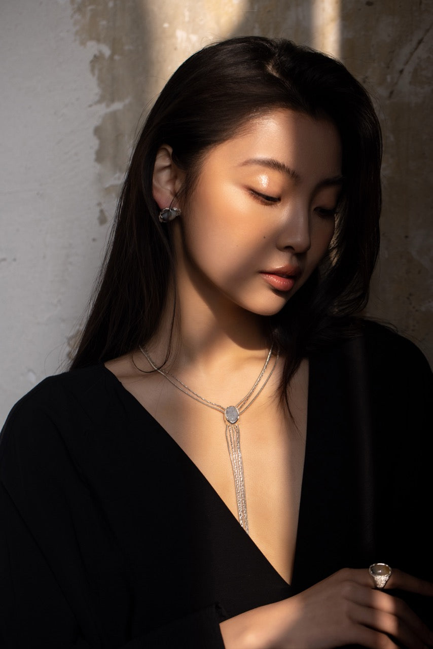A striking long necklace inspired by the depths of the ocean. It features a chain made of copper with silver plating, paired with a pendant crafted from 925 silver with enamel plating and ocean chalcedony. The tassel design adds movement and a sense of fluidity, creating a unique and elegant piece that brings the beauty of the sea to life.