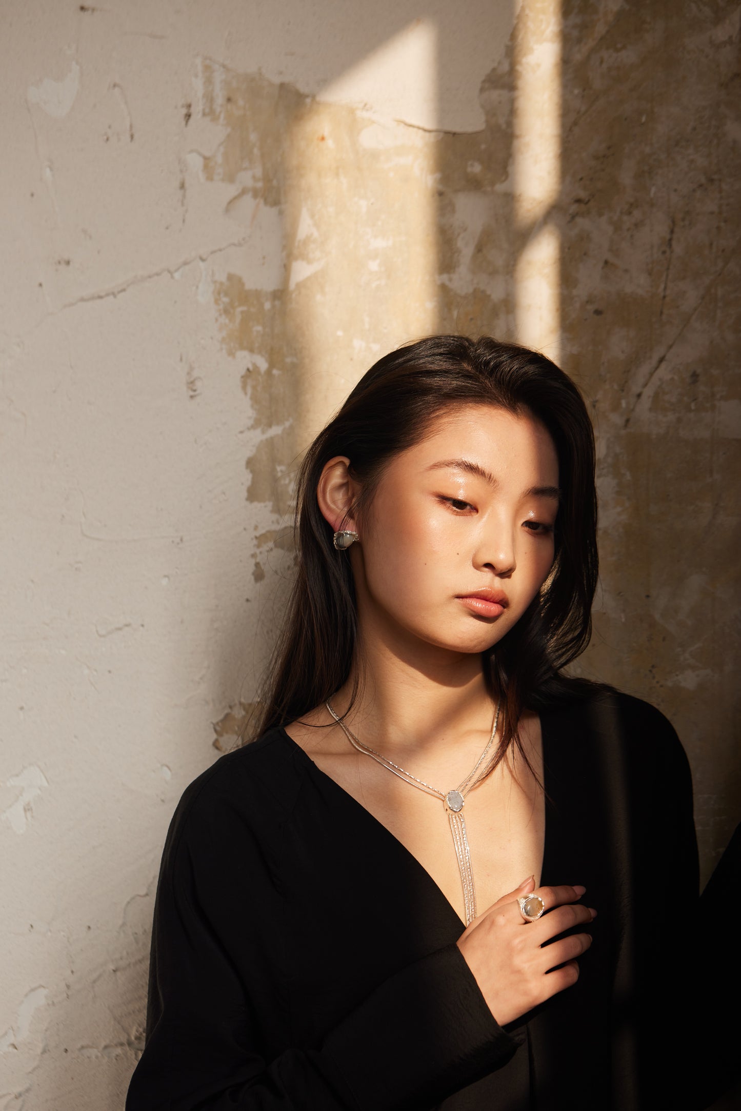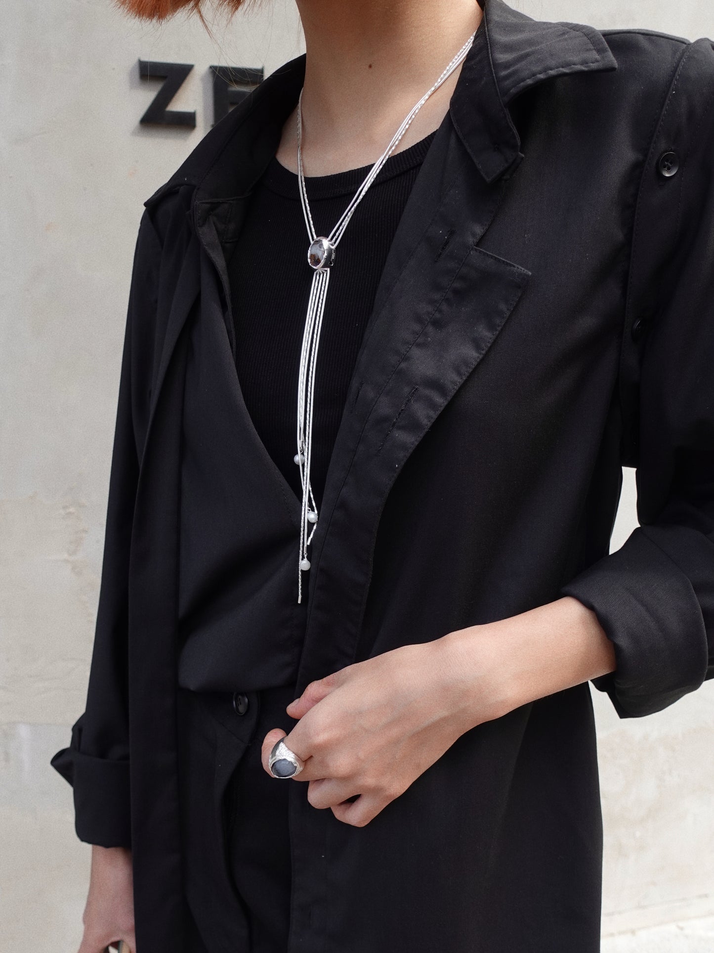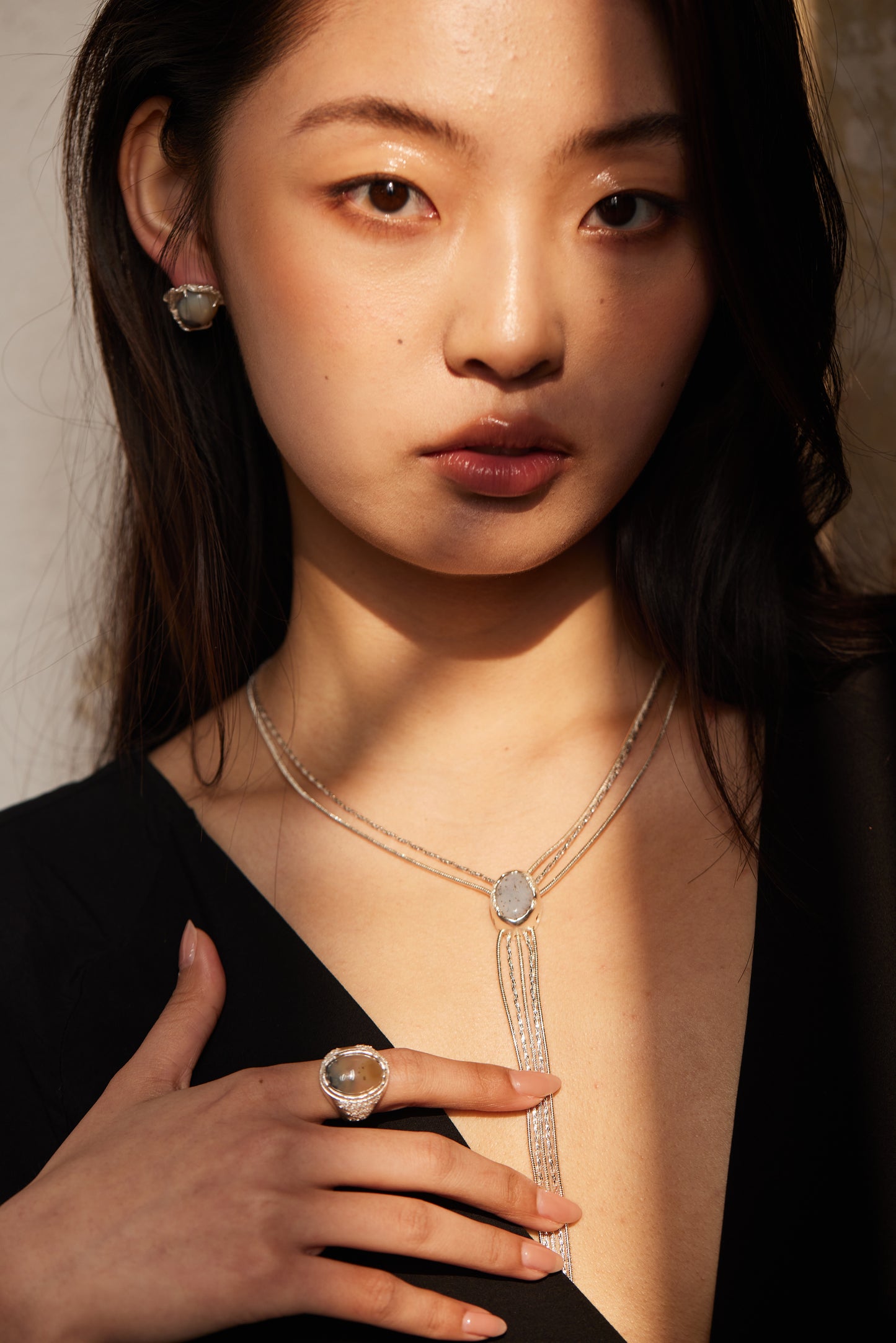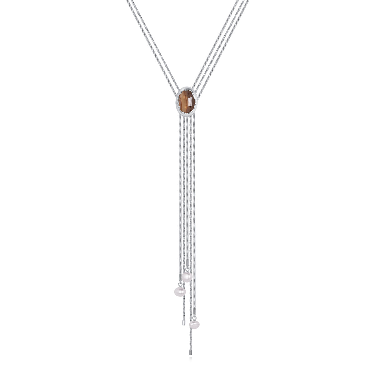 A striking long necklace inspired by the depths of the ocean. It features a chain made of copper with silver plating, paired with a pendant crafted from 925 silver with enamel plating and ocean chalcedony. The tassel design adds movement and a sense of fluidity, creating a unique and elegant piece that brings the beauty of the sea to life.