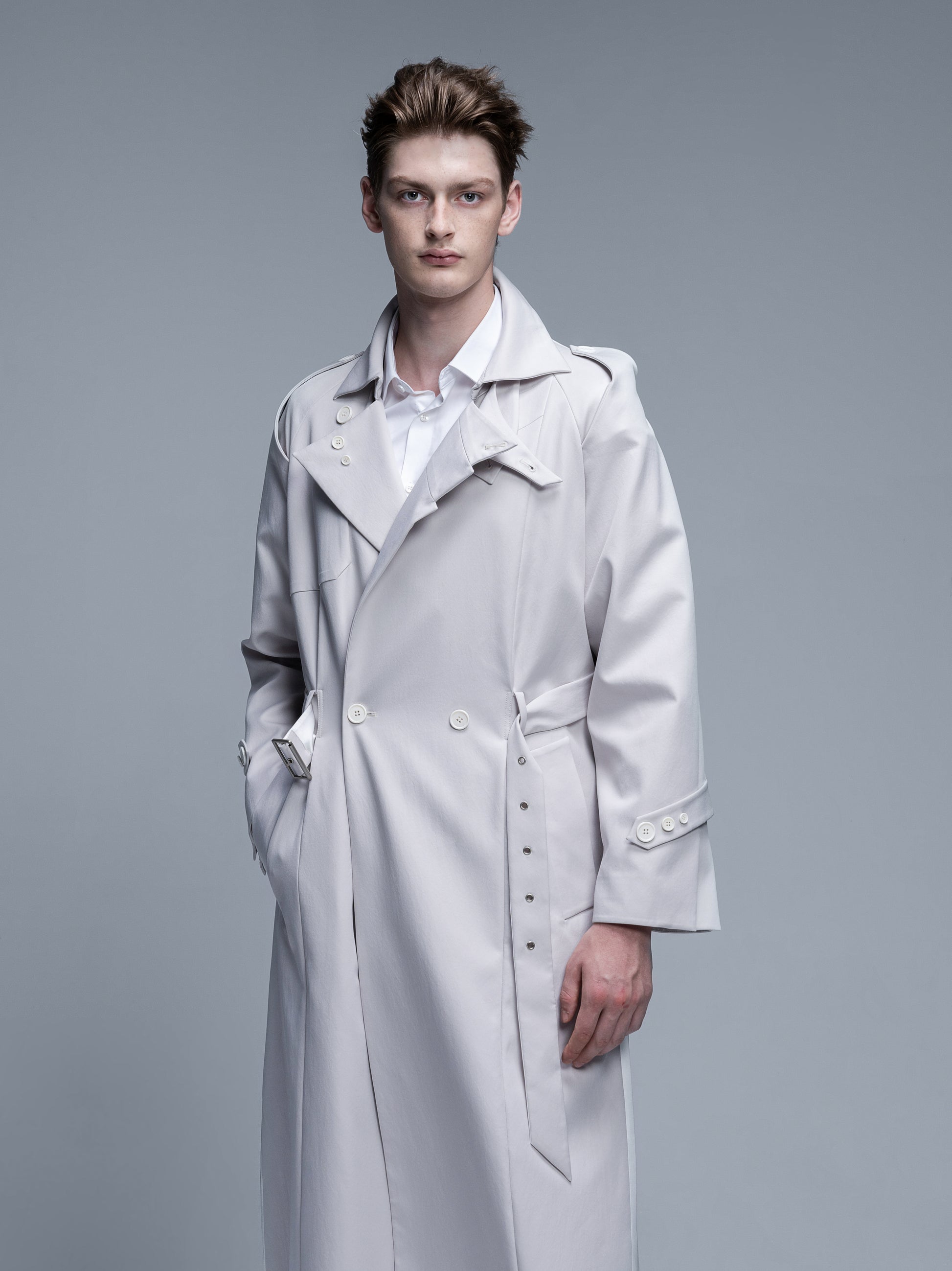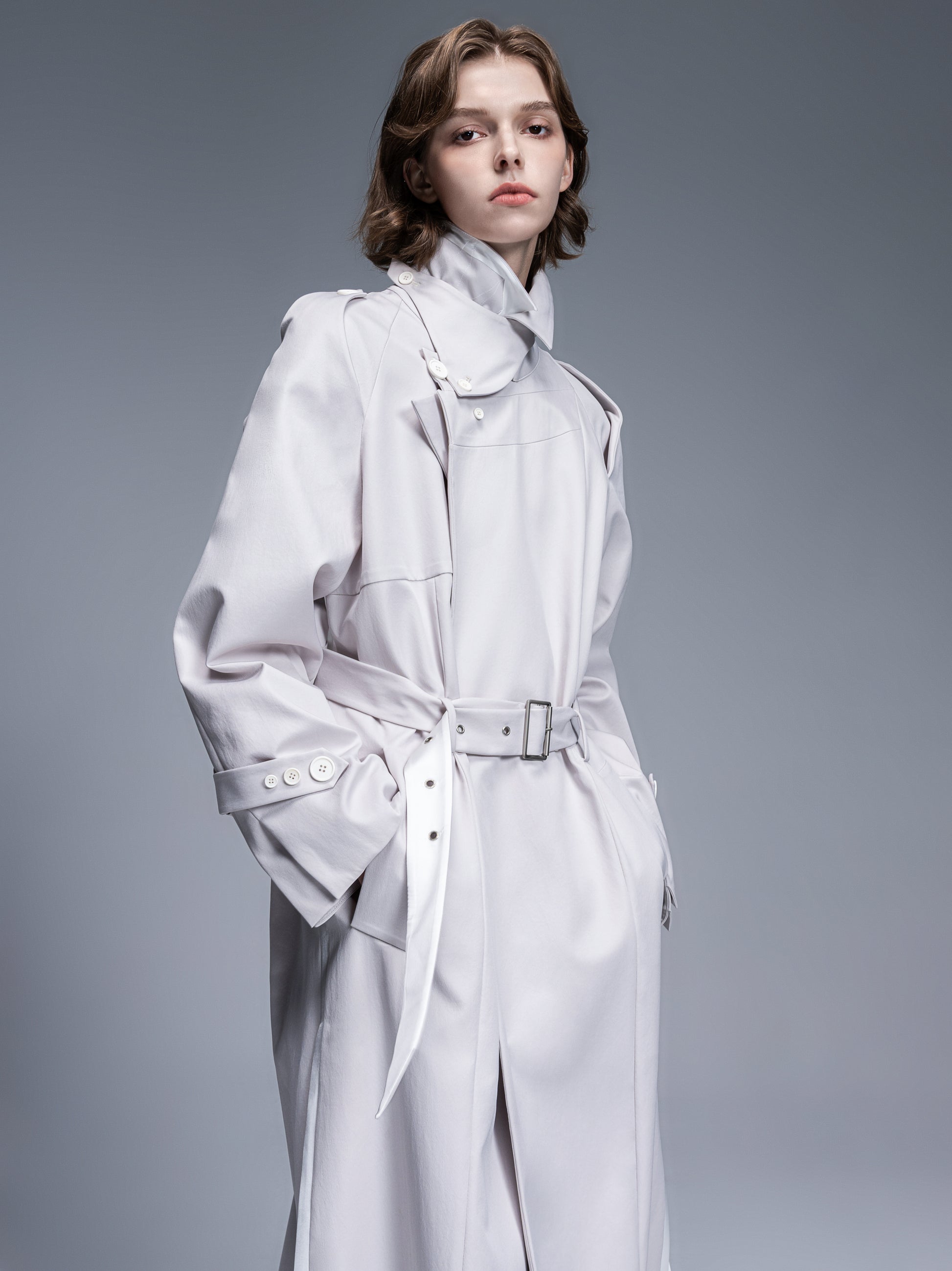 ·Designed as a classic double-breasted front, it is equipped with an adjustable belt and button cuffs. The back features eye-catching dragon skeleton sculptural details, a long cut and practical side pockets