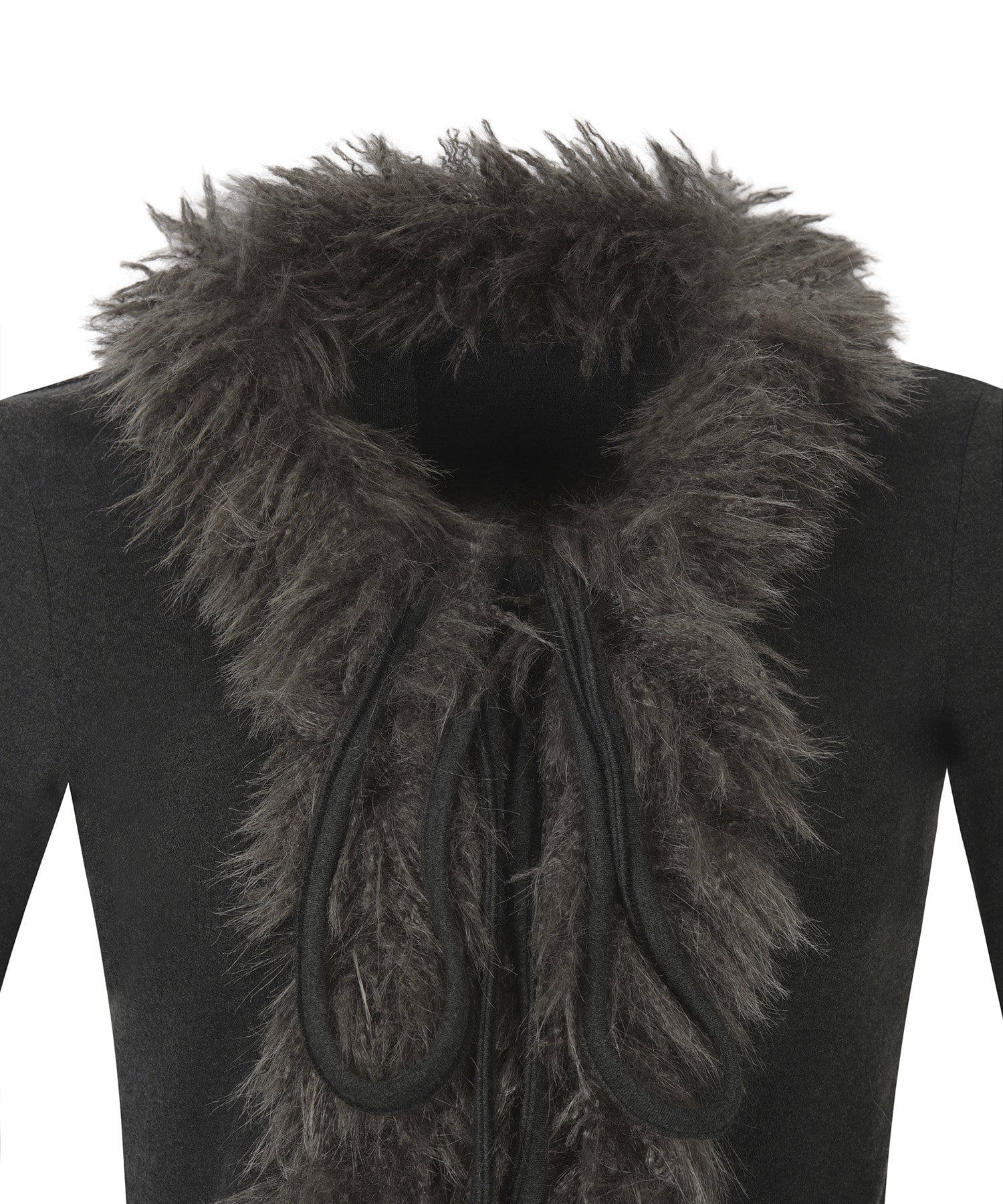 This cardigan features refined fur trimming accents that elevate the overall look. Designed with a string tie and hook closure for adjustable styling, it is finished with delicate embroidered details on the sleeves and a subtle label accent on the back for added character.