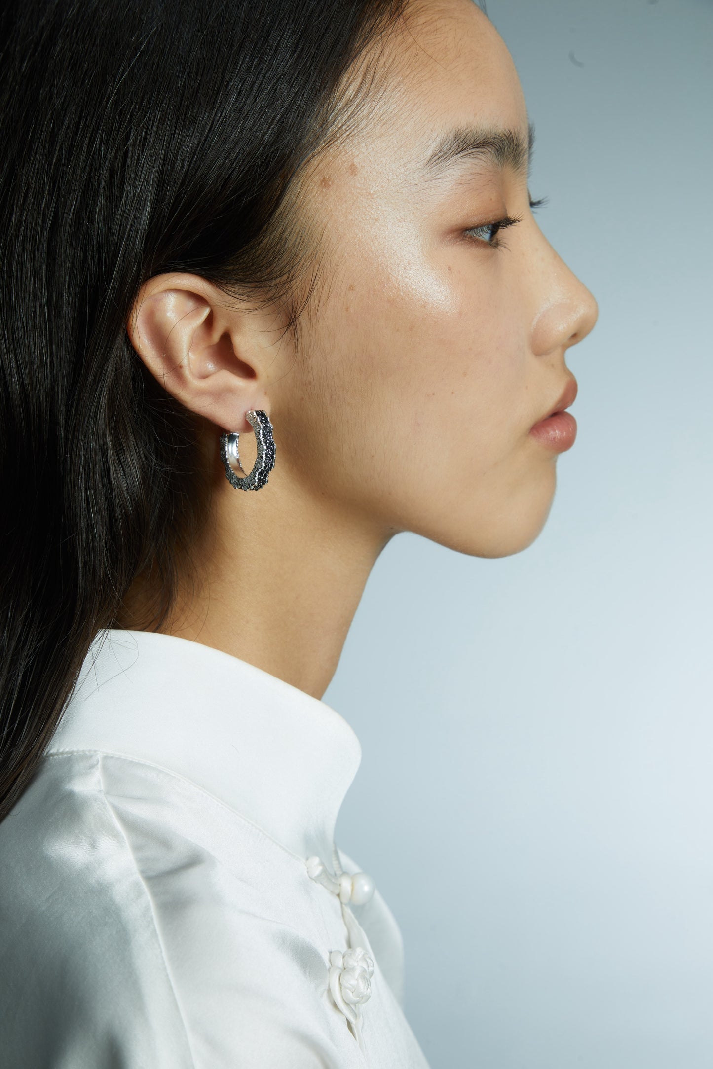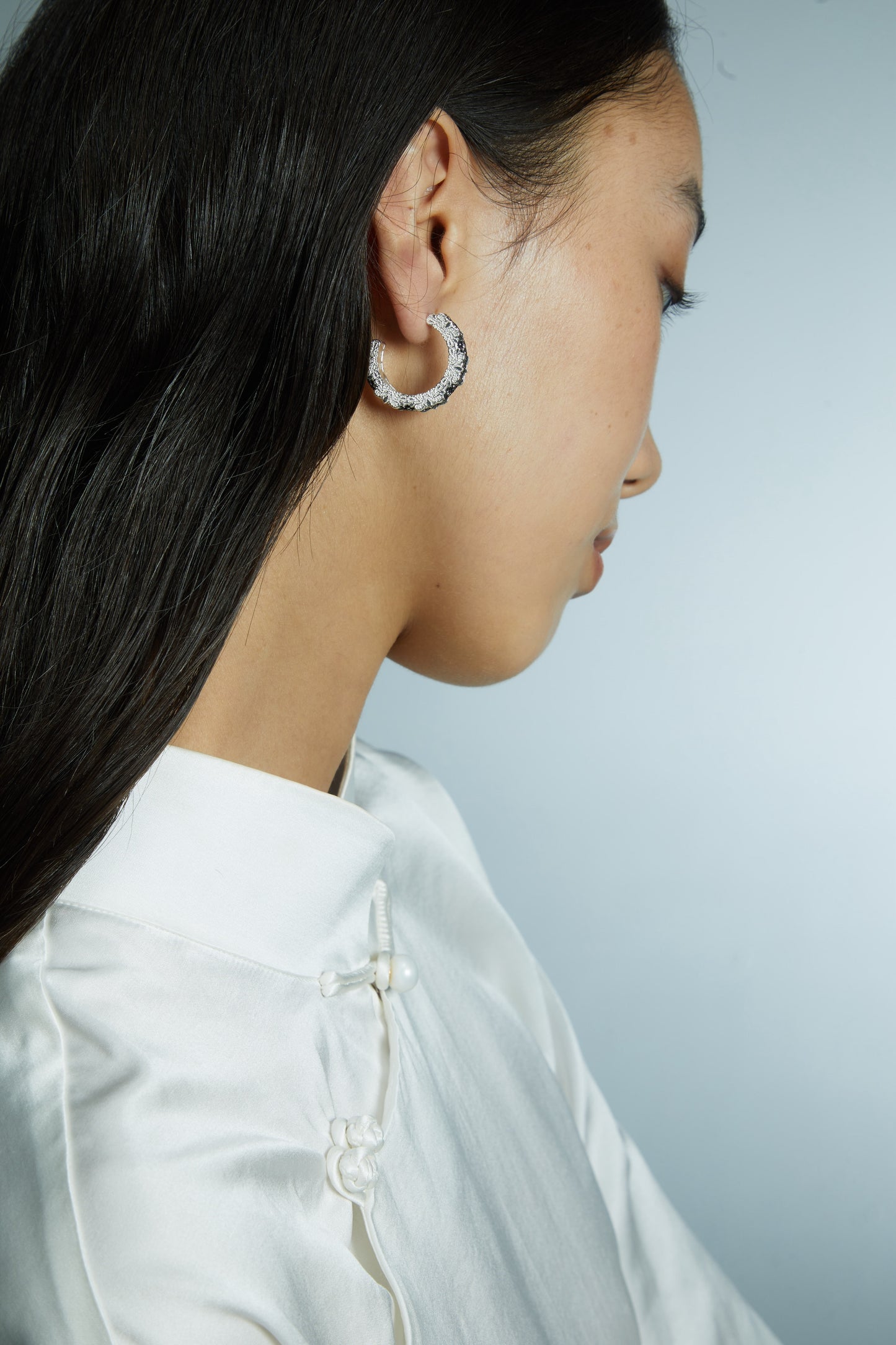 These elegant hoop earrings feature a unique embossed design inspired by delicate lace threads. Crafted from silver-plated copper with swim lacquer and 925 sterling silver ear posts, they offer a blend of durability and sophistication. Lightweight and stylish, they are perfect for daily wear or special occasions.