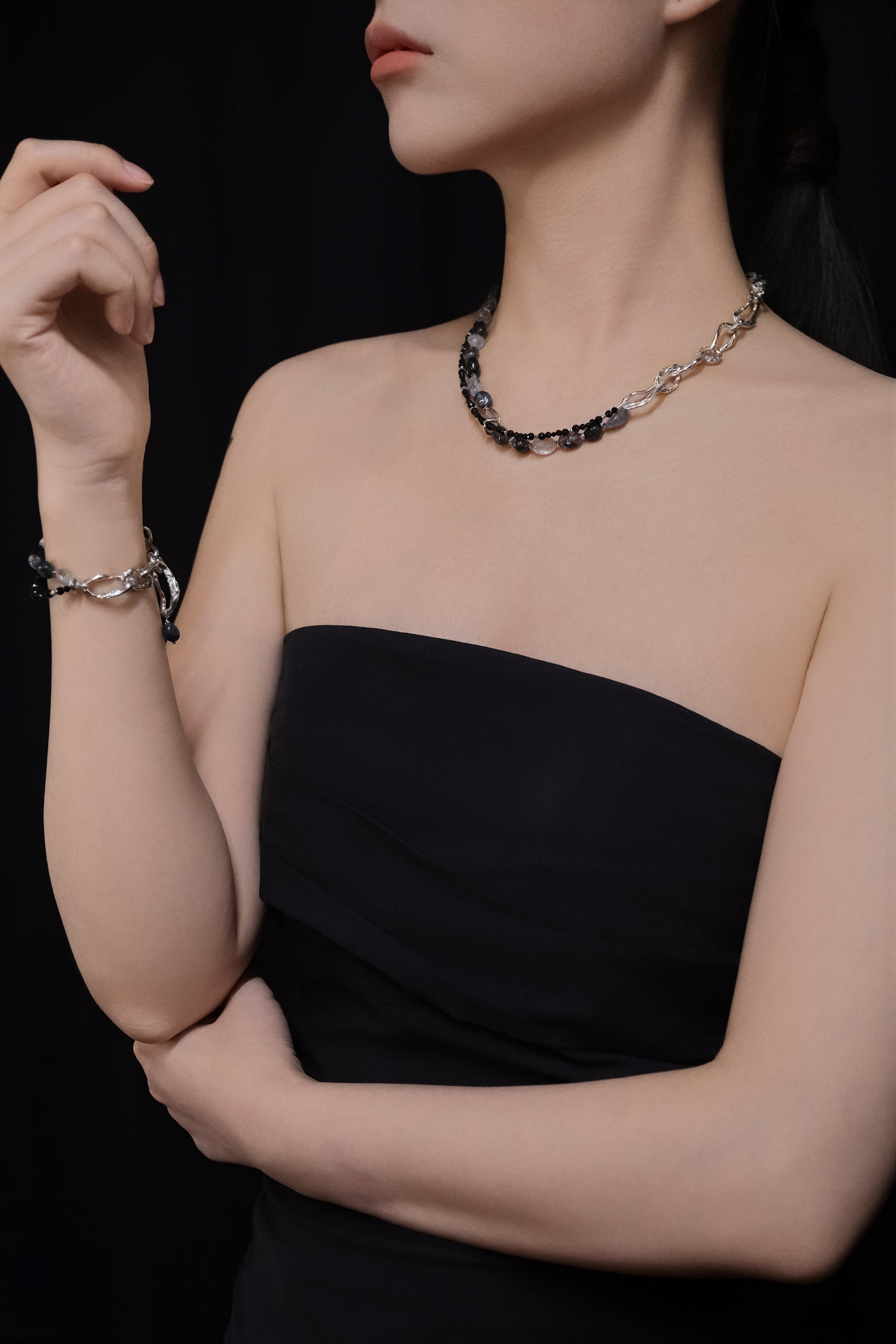 Twilight Star River Silver arcs descend, dark stars sink into the neckline of night. The bead strand condenses light at the turn, forging twilight into a silent river. Wind passes through the collarbone, the bracelet lingers low at the wrist— in the name of undercurrents, of star clusters yet to brighten. Time folds its wings, the Milky Way flows quietly upon the skin.
