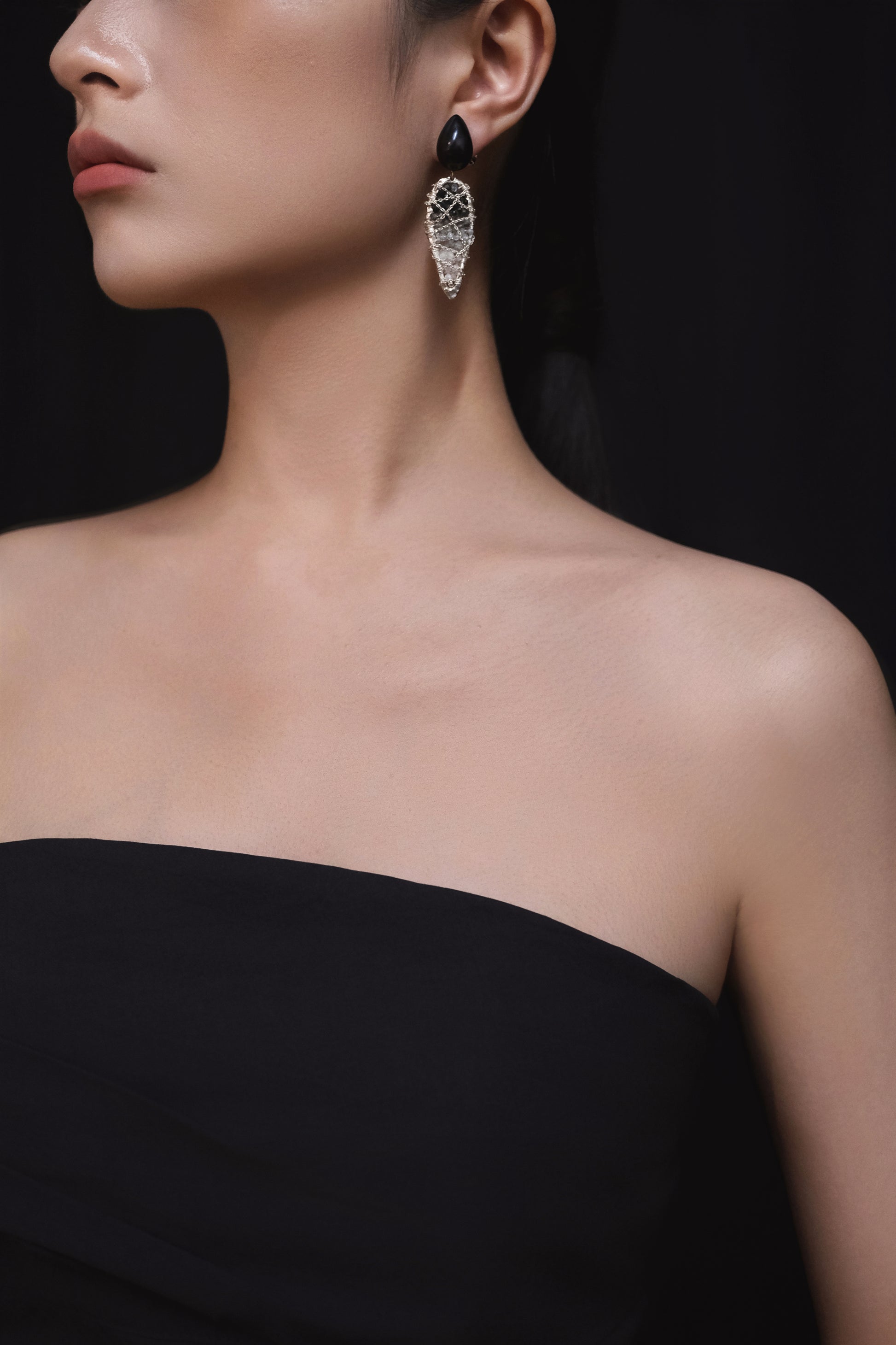 Mysterious black spinel, deep black rutilated quartz, raw and textured black diamond rough, interwoven with transparent American Herkimer diamonds and zirconia, as if condensing fragments of the Milky Way into a gradient poem. Each tiny gem is hand-strung with fine silver wire, layered and staggered like time sedimented within metallic veins. The silver chain flows like a river of light, weaving between the rhythm of black and white, refracting a mobile sharpness. Ebony, in its most humble stance, uplifts the entire starry expanse; its warm black-brown hue provides the perfect stage for the dazzling gems. The silver chain undulates over the wooden surface like gravitational waves, perfectly merging the earth's steadiness with the galaxy's dynamism.