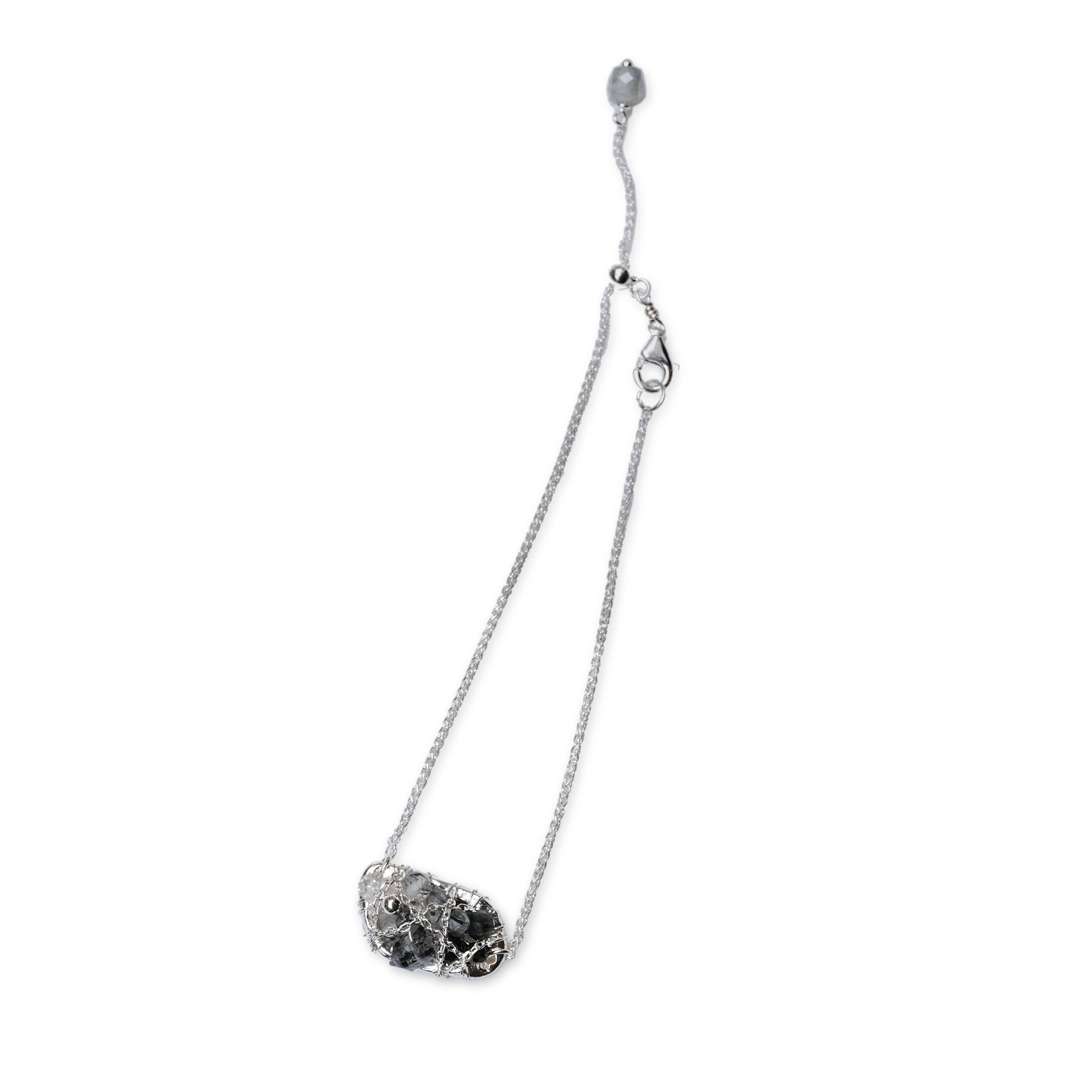 Mysterious black spinel, deep black rutilated quartz, raw and textured black diamond rough, interwoven with transparent American Herkimer diamonds and zirconia, as if condensing fragments of the Milky Way into a gradient poem. Each tiny gem is hand-strung with fine silver wire, layered and staggered like time sedimented within metallic veins. The silver chain flows like a river of light, weaving between the rhythm of black and white, refracting a mobile sharpness. Ebony, in its most humble stance, uplifts the entire starry expanse; its warm black-brown hue provides the perfect stage for the dazzling gems. The silver chain undulates over the wooden surface like gravitational waves, perfectly merging the earth's steadiness with the galaxy's dynamism.