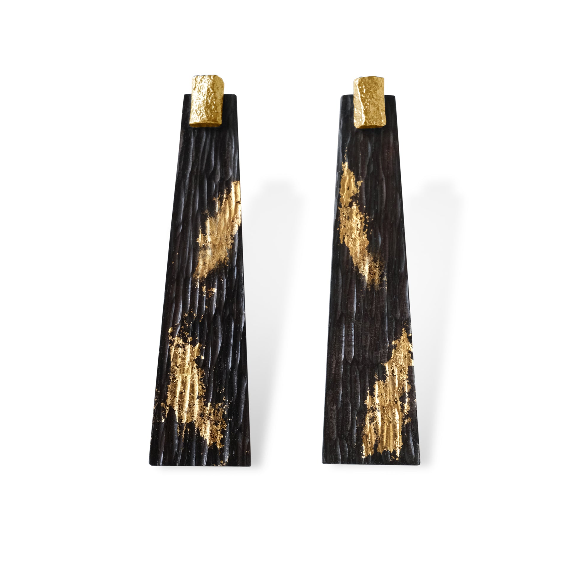 Ink Condenses the Night, Golden Sleet Breaks the Dawn The Art of Eastern Expressive Aesthetics in Lacquer Earrings Ebony wrapped in the wild texture of lacquer, 24K gold leaf sweeps like a brushstroke, leaving untamed, expressive trails. Each golden vein is a gesture of nature, each speck of gold glimmers softly in the dark—a deliberate, unchecked flick of the artisan's wrist. We capture this beauty of the 'unfinished,' letting gold leaf fly freely like sleet, transforming on the sandalwood surface into moonlight reflecting on snow fallen through pines, or into flowing golden ink within an inkstone.