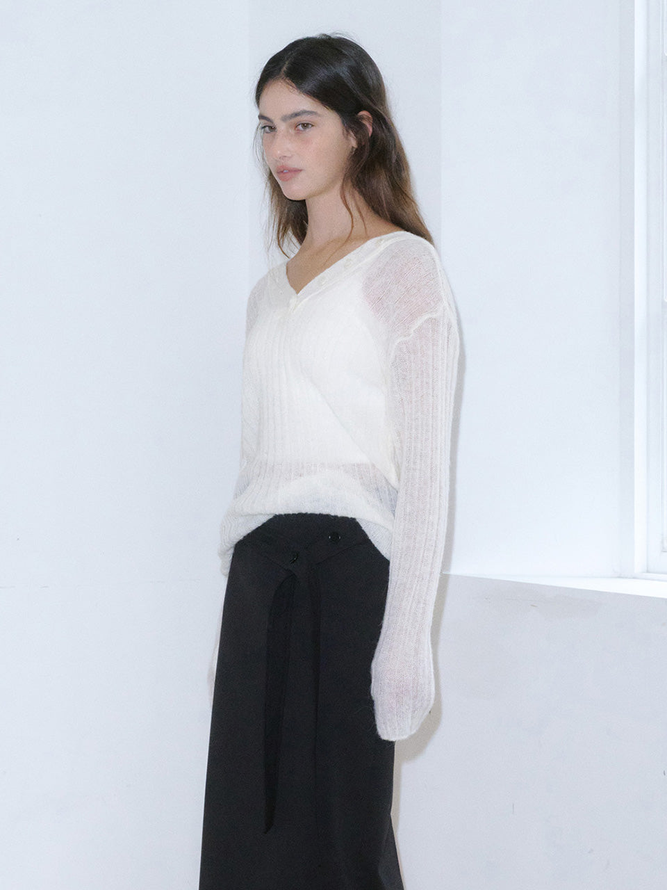 A V-neck cardigan crafted in a loosely ribbed knit, adding subtle sheerness for a feminine touch.