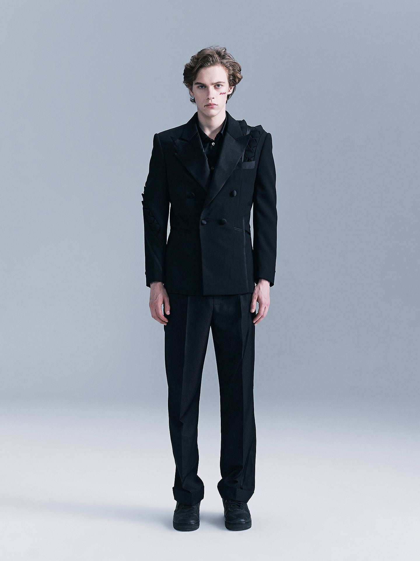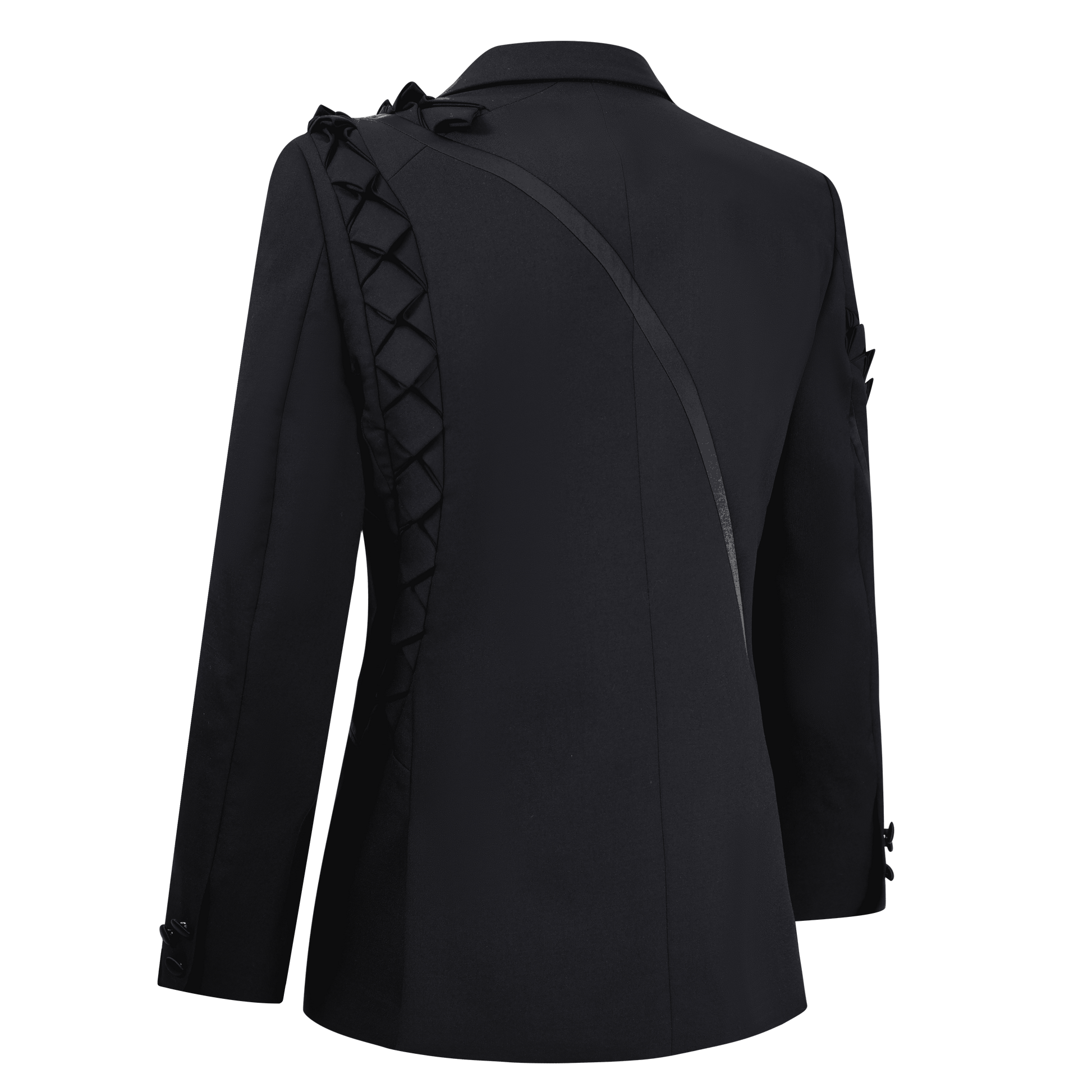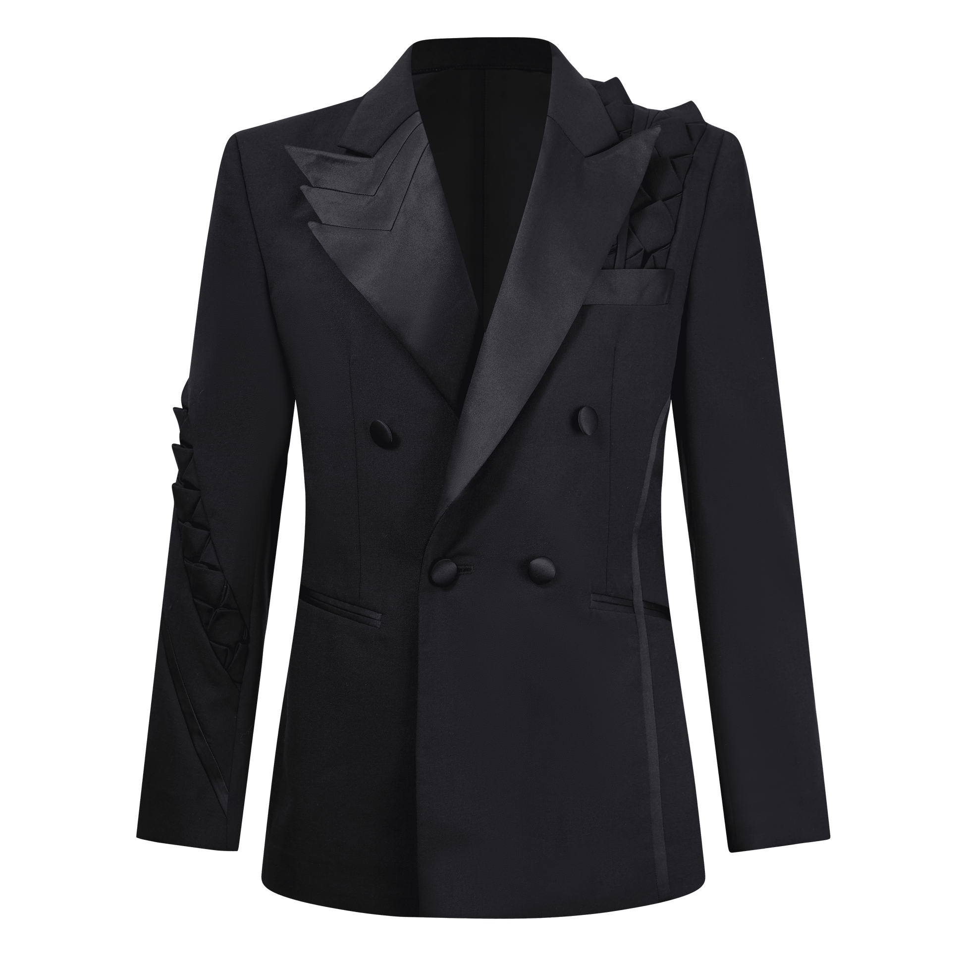 ·Crafted from black wool fabric, the shoulders and sleeves are decorated with a snake scale-inspired patchwork design. The hip lapel design, double-row button front opening, and three-dimensional shoulder shape create a strong visual profile. It comes with welt pockets and button-down cuffs, featuring a slim fit.