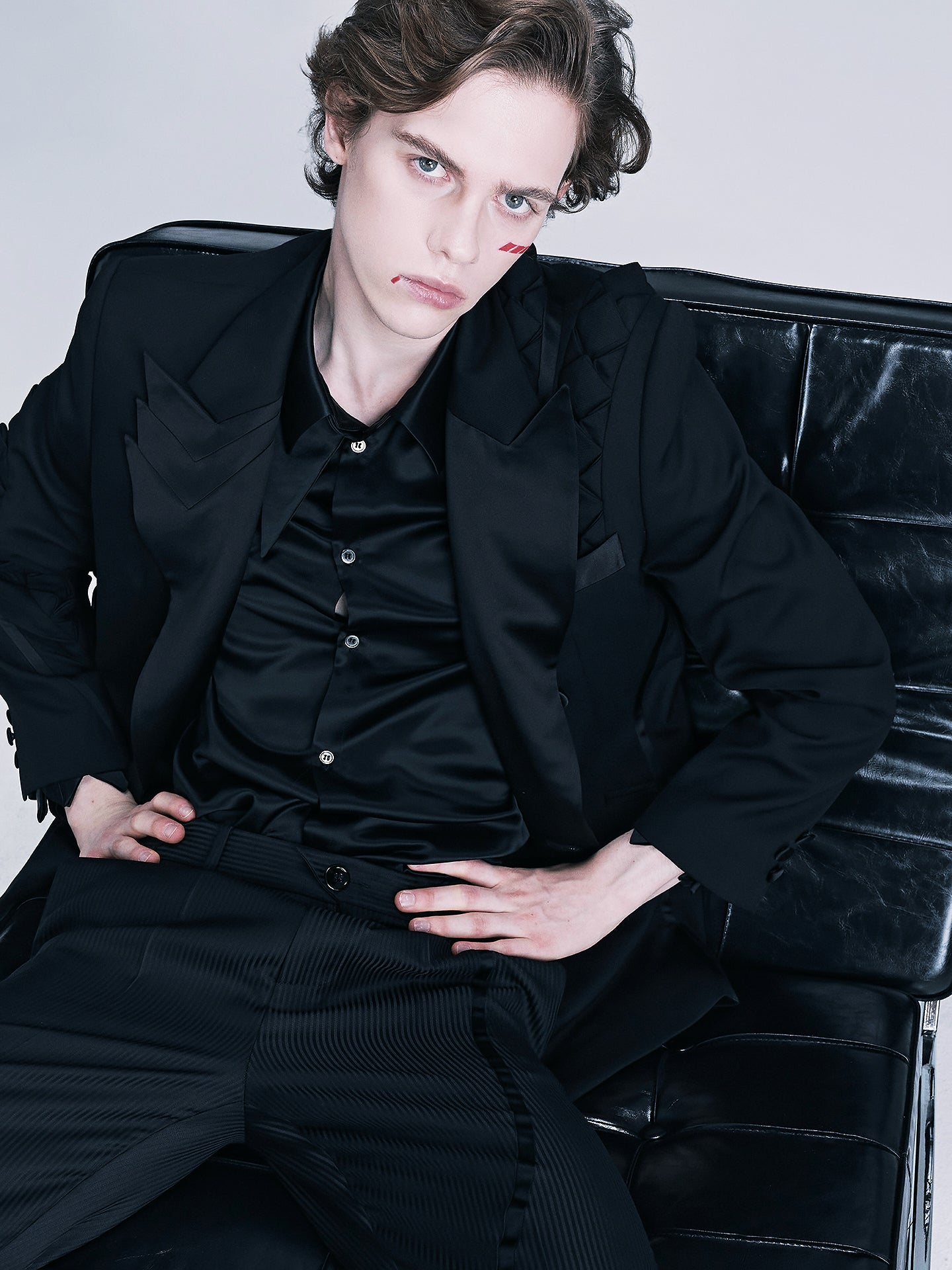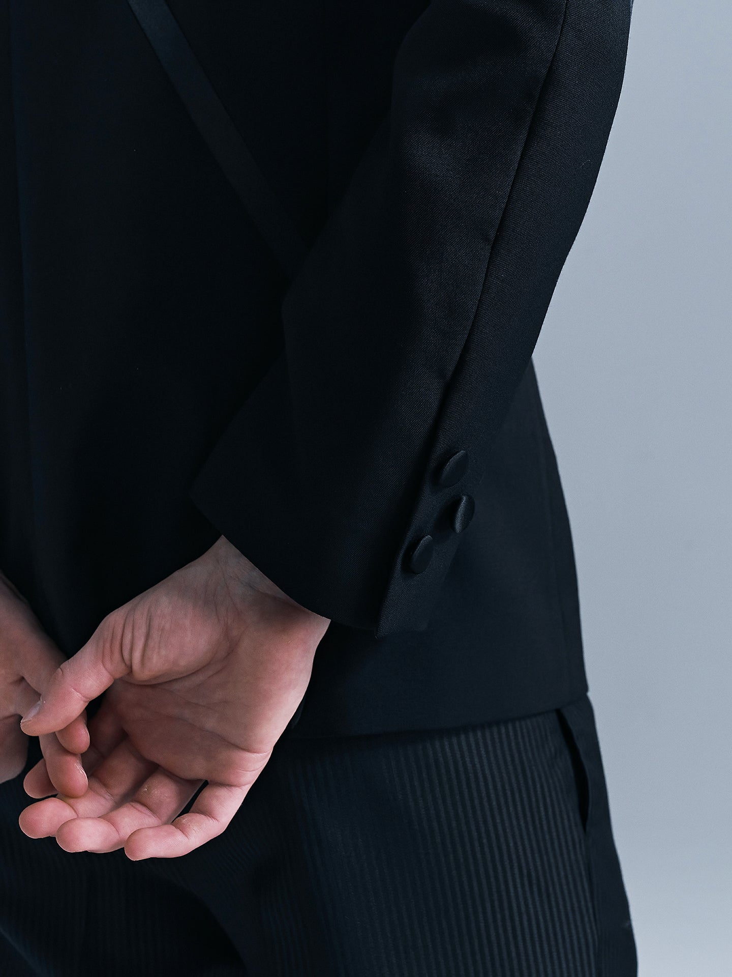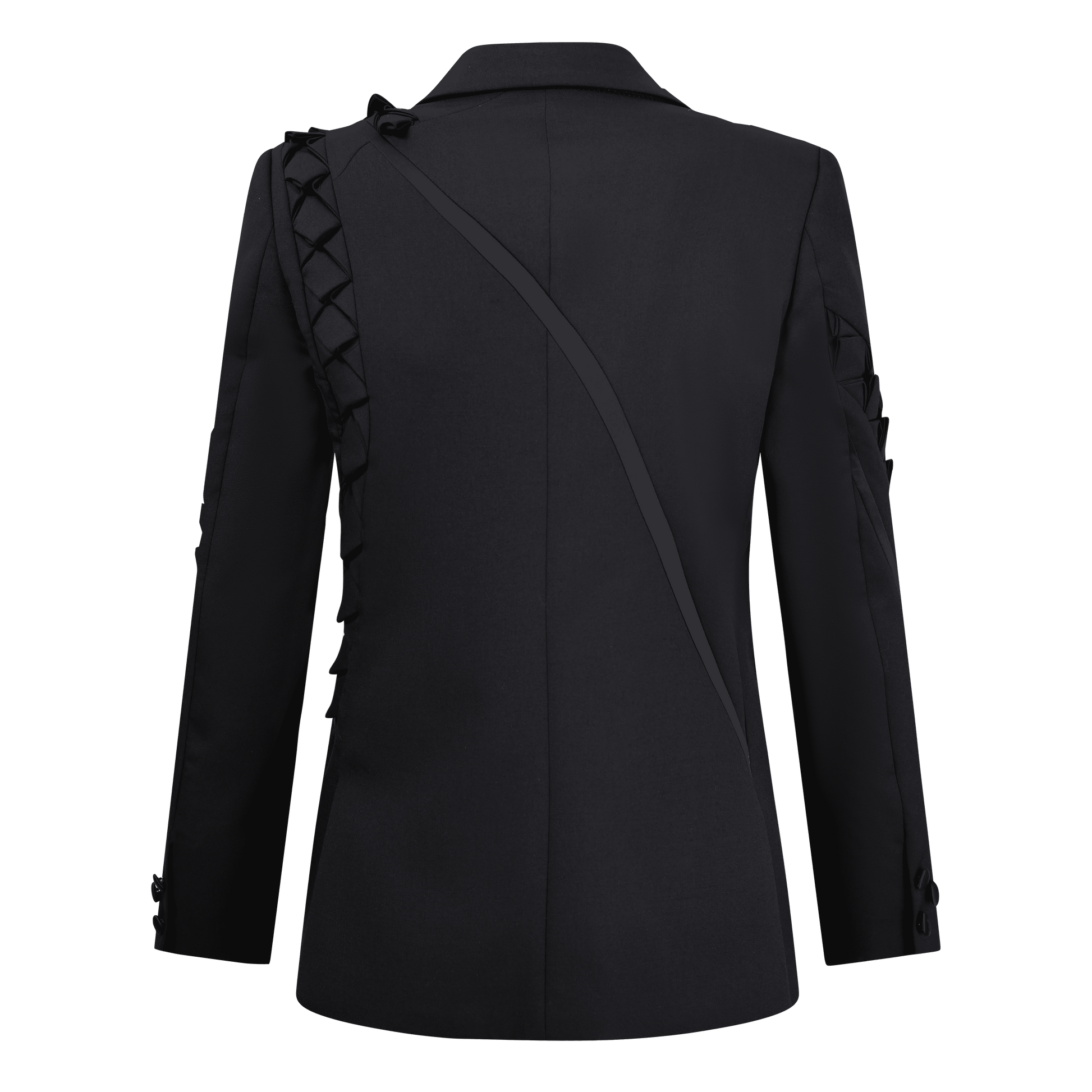·Crafted from black wool fabric, the shoulders and sleeves are decorated with a snake scale-inspired patchwork design. The hip lapel design, double-row button front opening, and three-dimensional shoulder shape create a strong visual profile. It comes with welt pockets and button-down cuffs, featuring a slim fit.