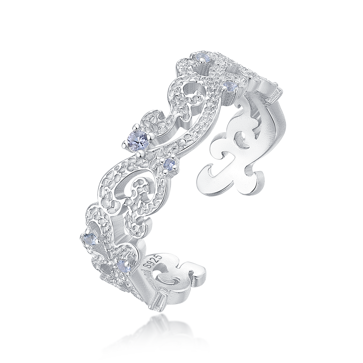 Crafted in 925 sterling silver with a bright silver finish and protective e-coating, this vine-set ring features a synthetic spinel, combining intricate texture with refined sparkle inspired by the serene elegance of the Ethereal Void.