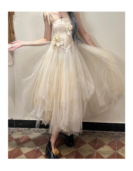 Garden Spirit Bustier Tulle Dress (Detachable Straps)- Handmade-Yellow Floral Version