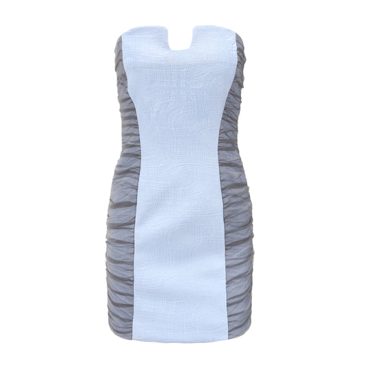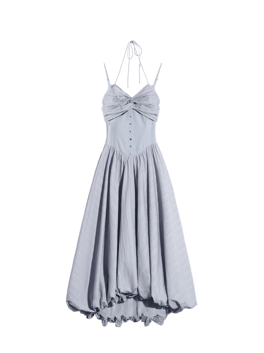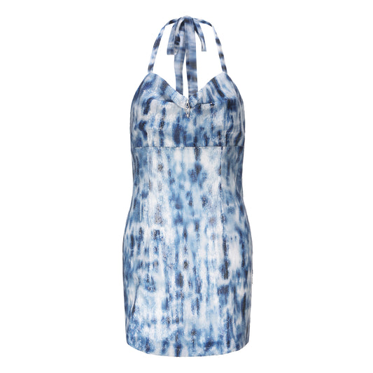 Blue and White Sequined Elastic Waist Halterneck Dress