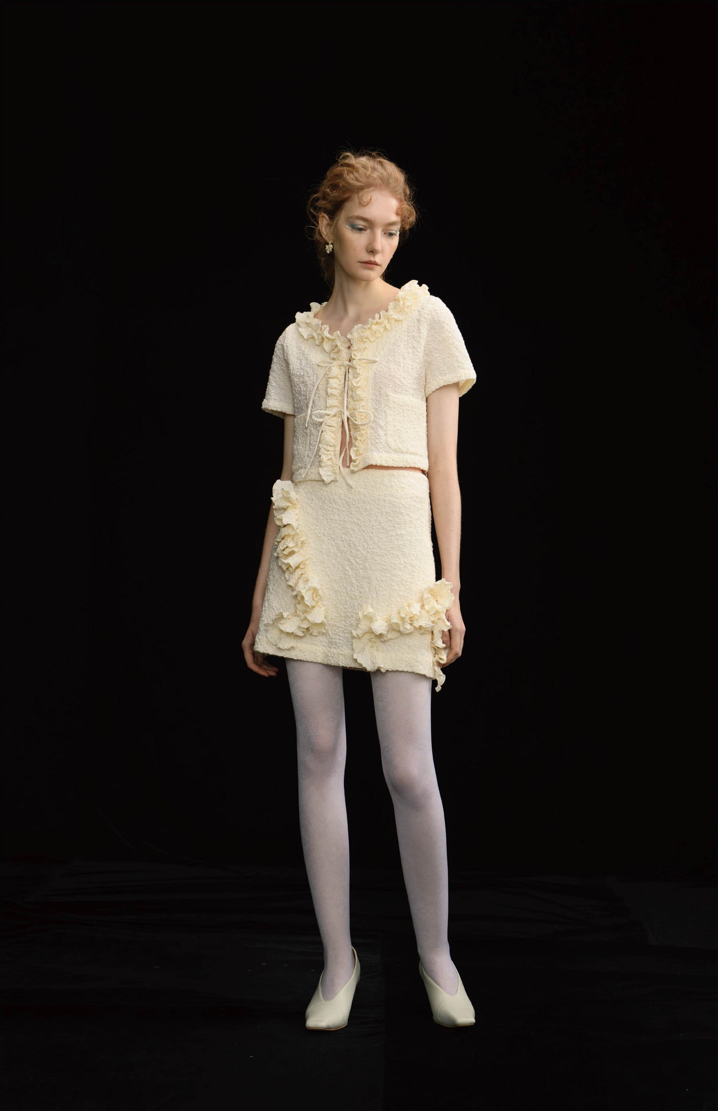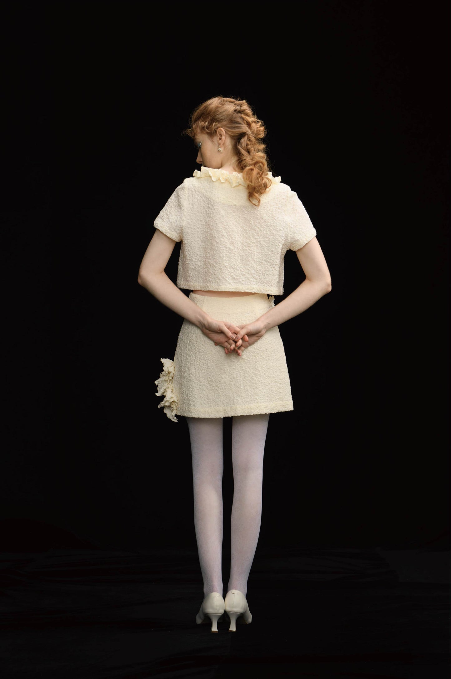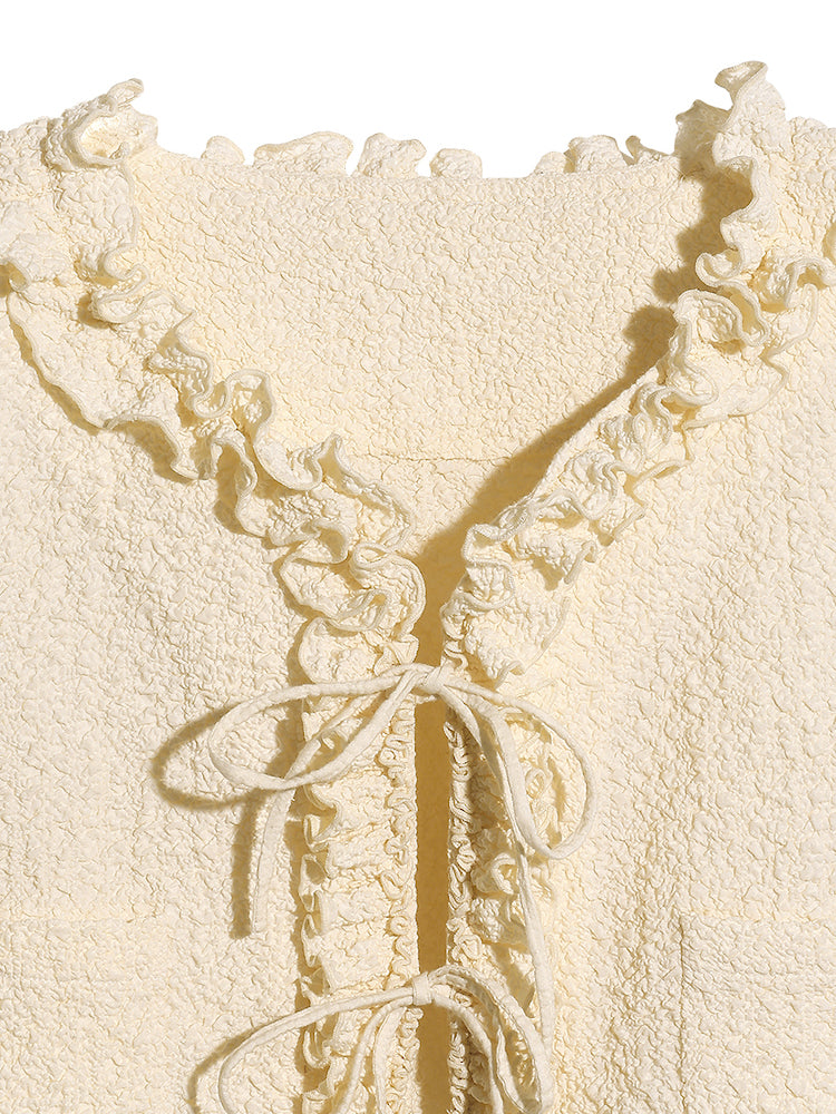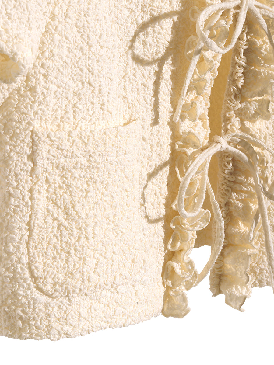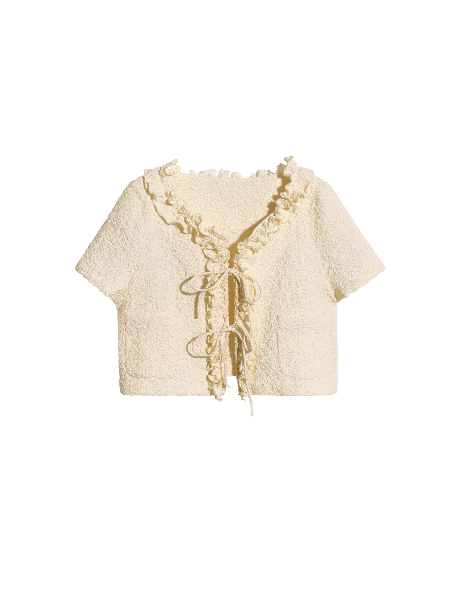 Unique Textured Fabric with Stretch Fiber, Comfortable and Accommodating Boxy Fit, Cropped Design for Lengthening Lower Body Proportion, Handmade Lace with Tie Detail, Subtle Cutout for Understated Sexiness, Feminine Softness and French Neutral Charm, Breaking Traditional Labels