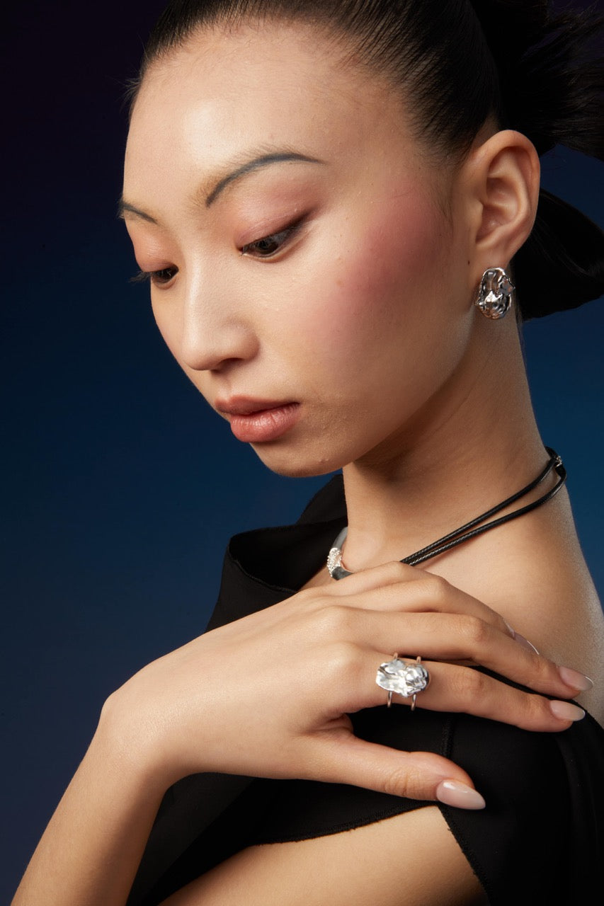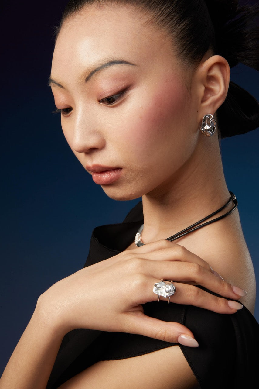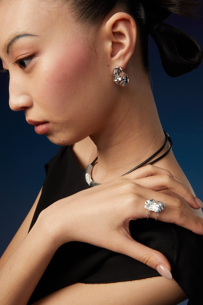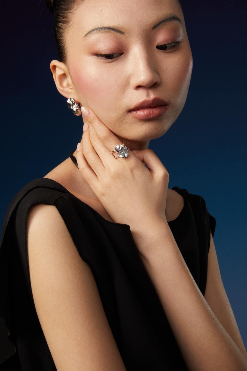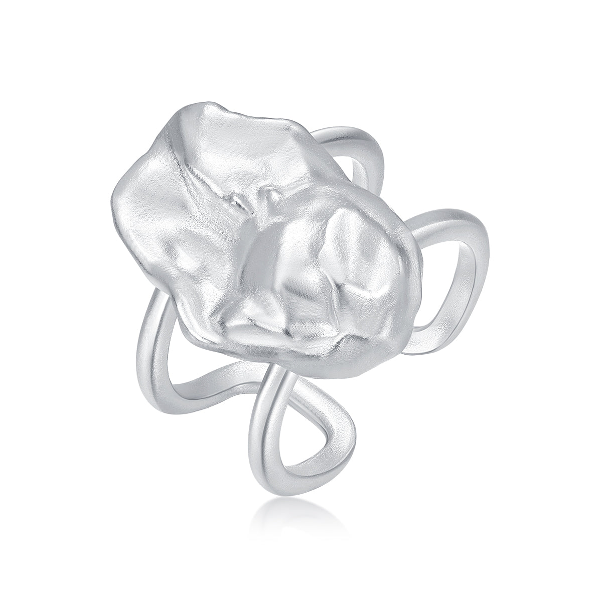 A striking ring crafted from 925 sterling silver with a polished silver plating and smooth enamel finish. Featuring a unique baroque-inspired design, this ring combines boldness with sophistication, perfect for making a statement in any ensemble.