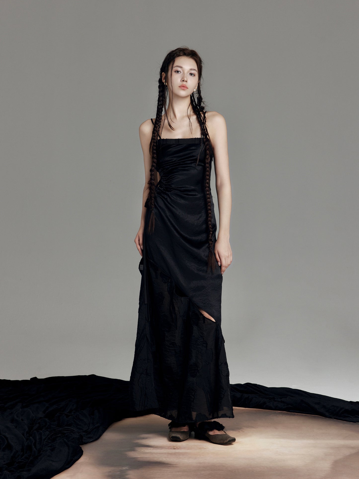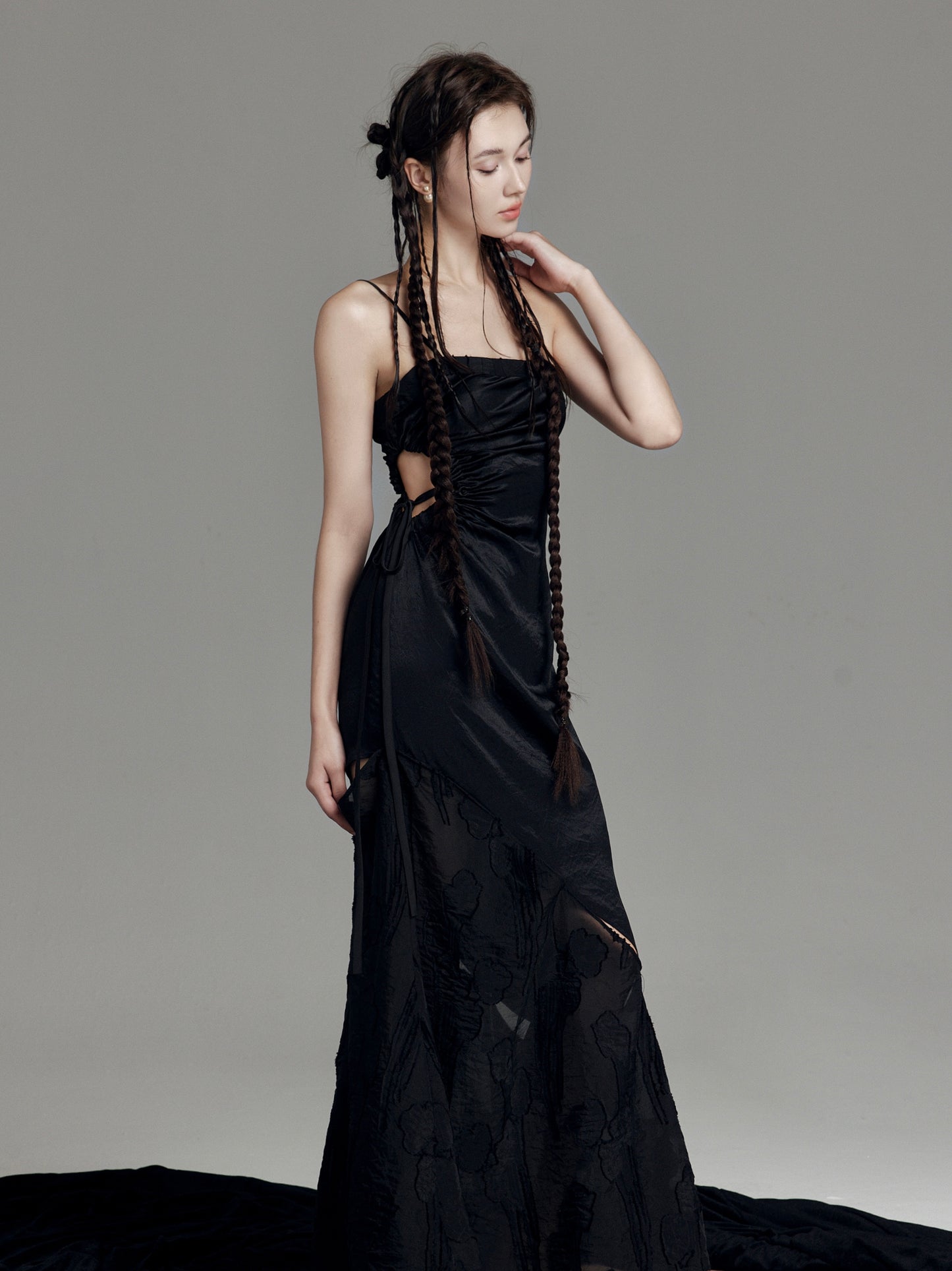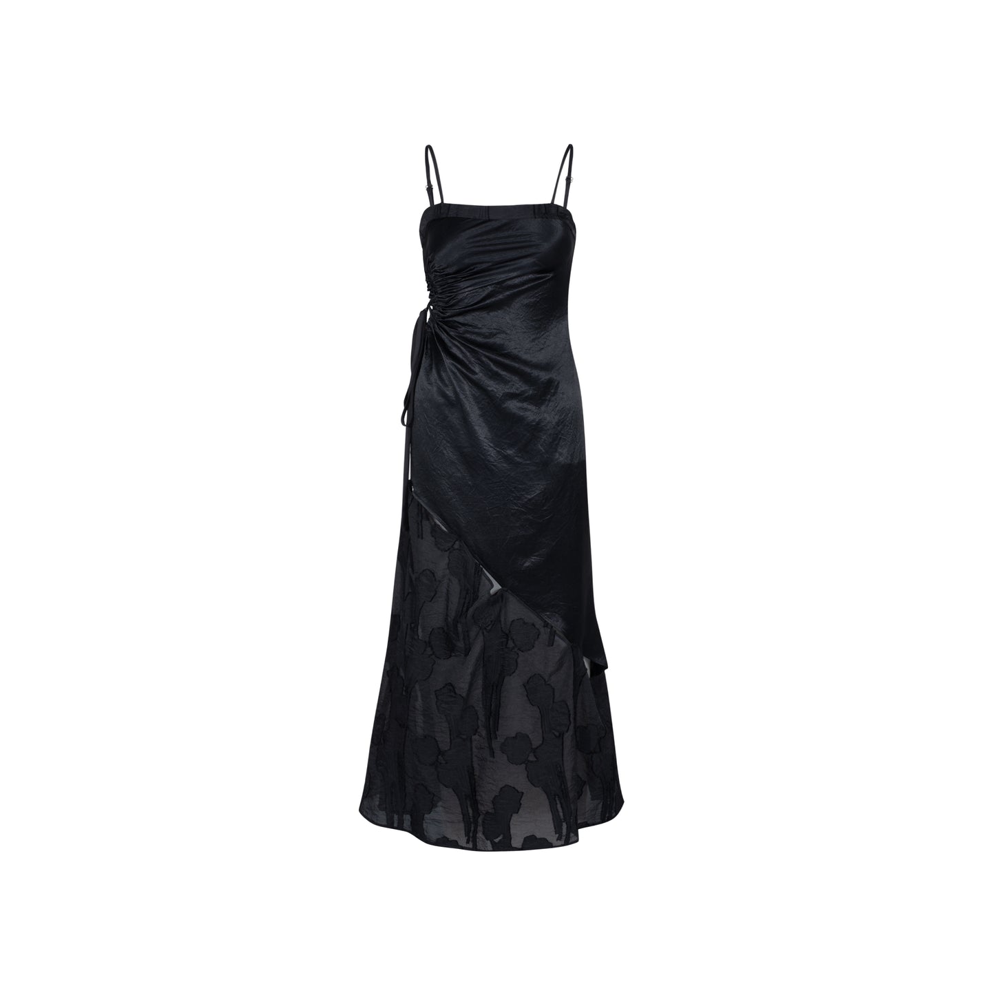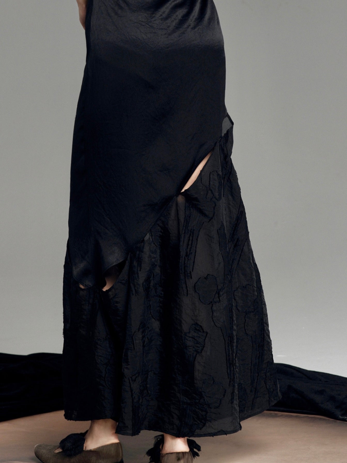 The dress is made of two types of materials. Material A is 100% Acetate, and Material B is a blend of 91% Tencel and 9% Silk Cotton