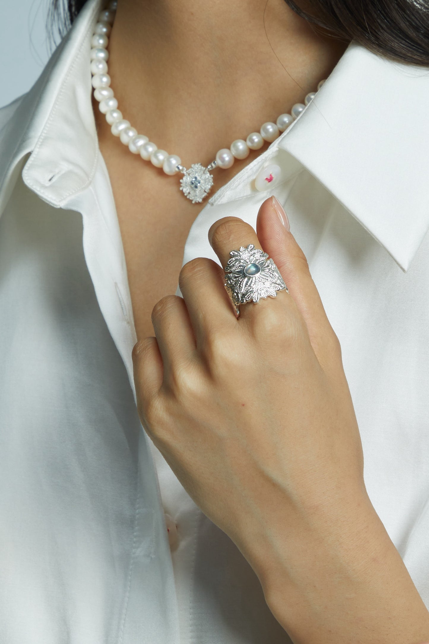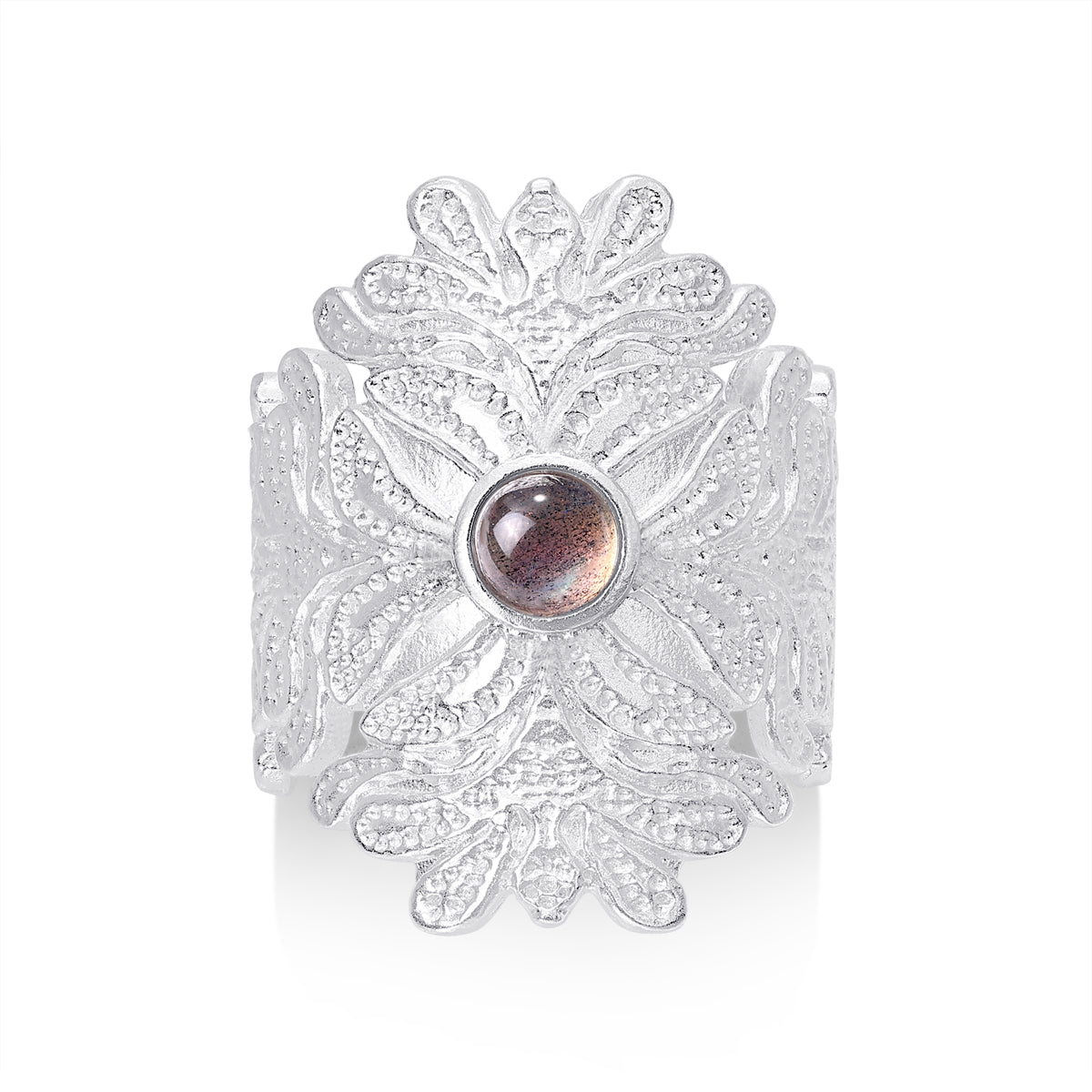 This stunning wide ring showcases an intricate lace-inspired design paired with the natural shimmer of labradorite. Crafted from 925 sterling silver plated with bright silver and finished with swim lacquer, it’s a timeless piece that exudes elegance and sophistication. Ideal for adding a touch of glamour to any outfit.