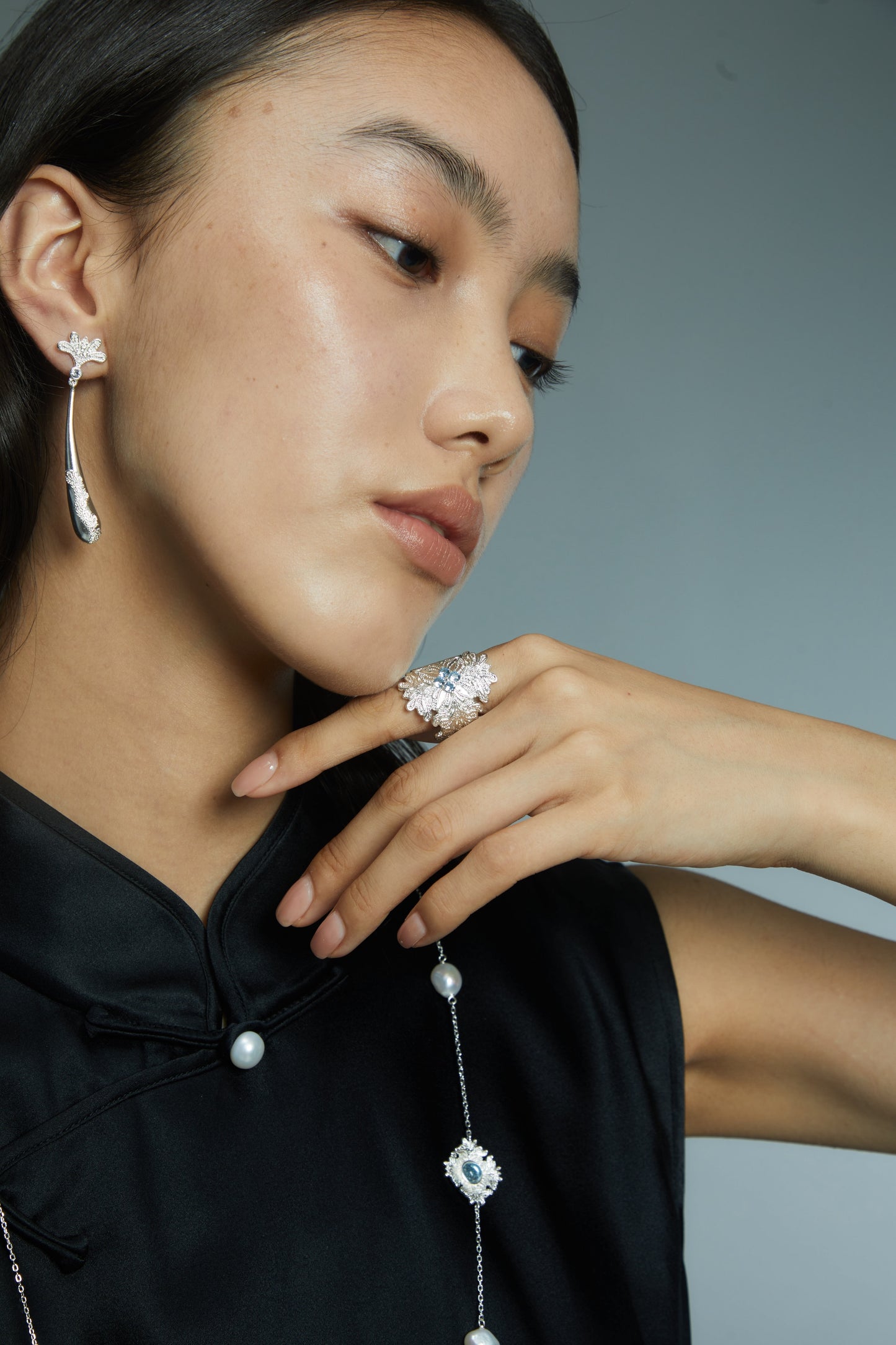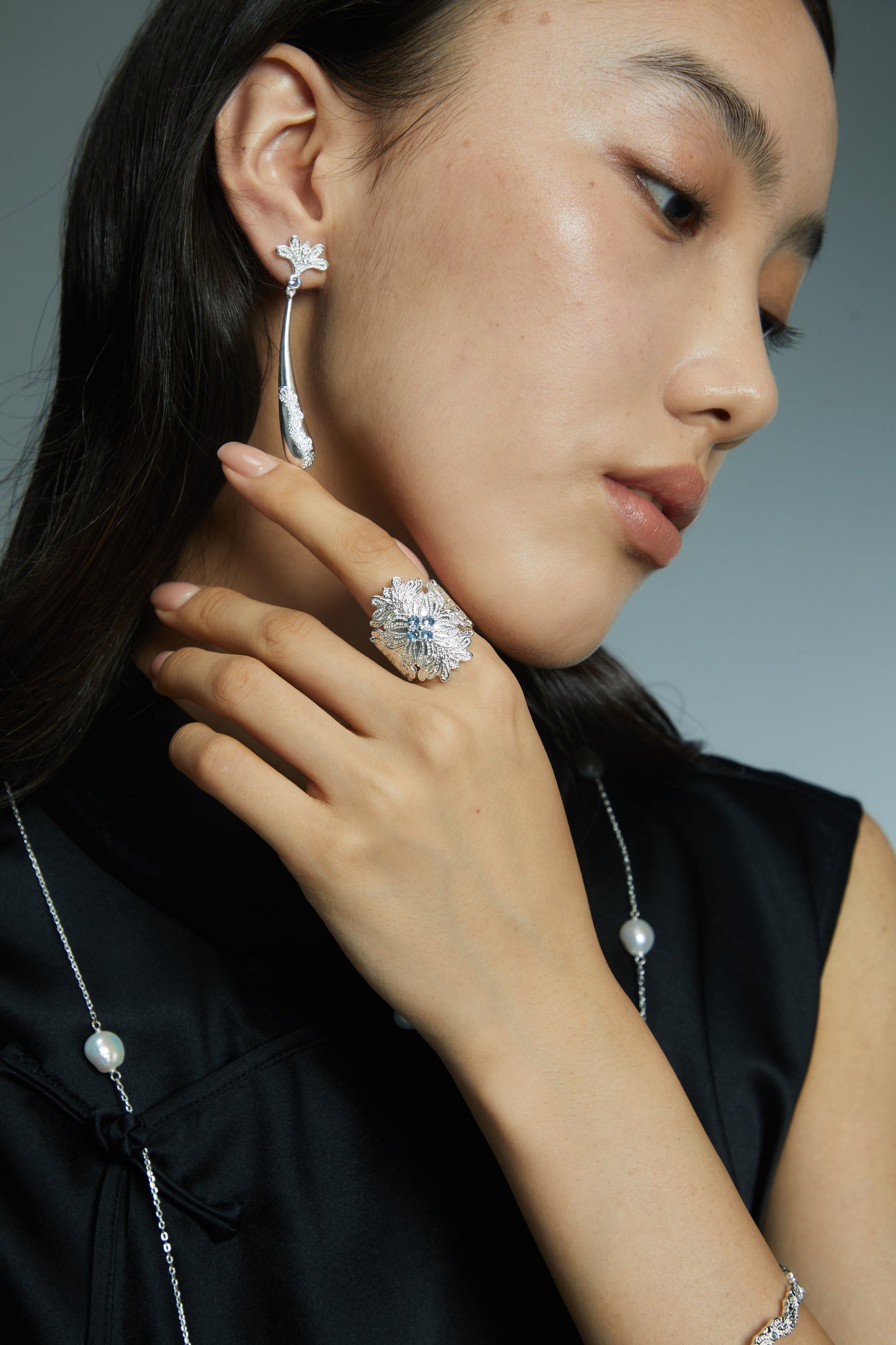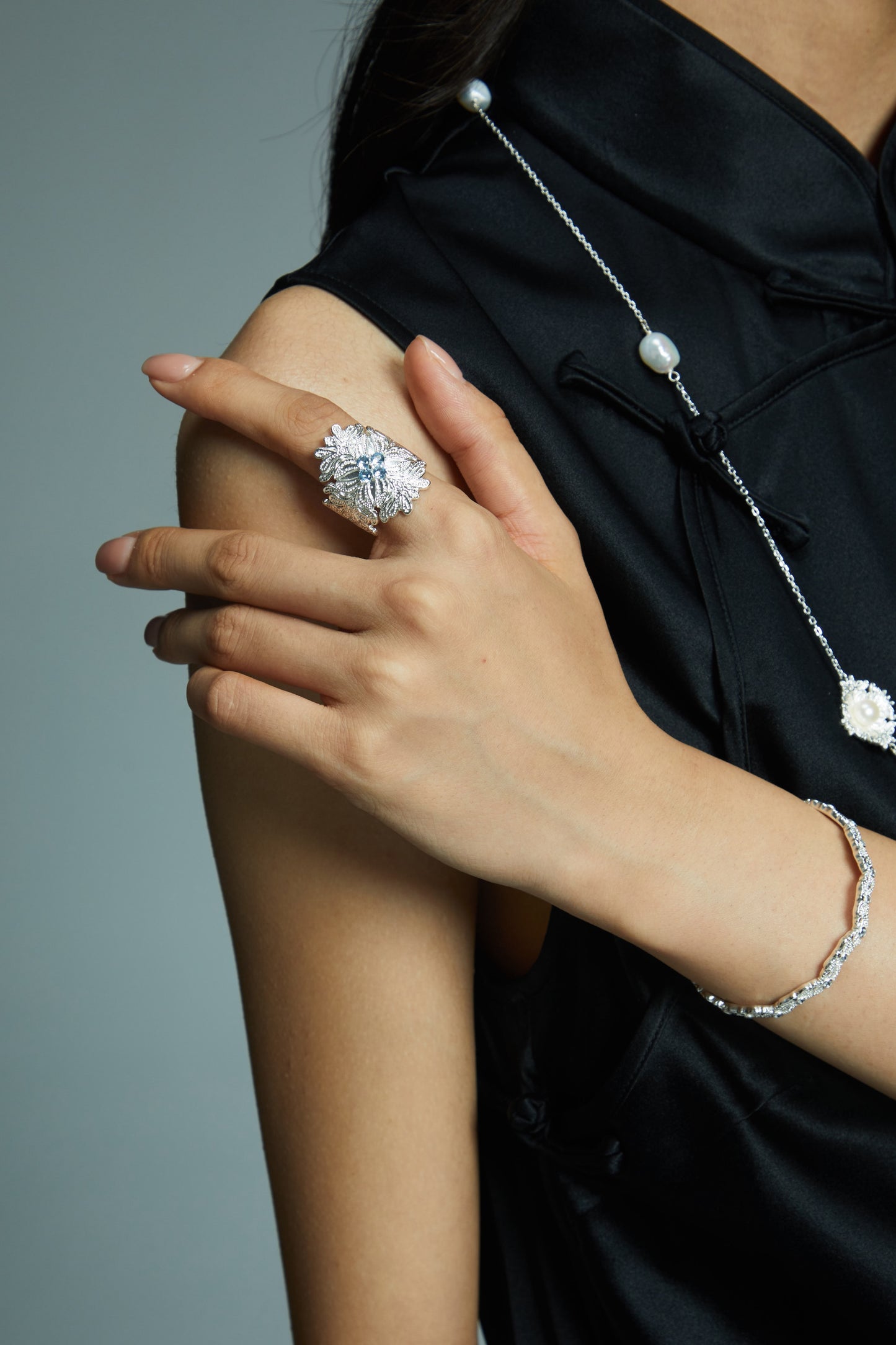 This statement wide ring features intricate lace-inspired detailing, enhanced by the sparkle of synthetic spinel stones. Made from 925 sterling silver plated with bright silver and finished with swim lacquer, this ring merges elegance with durability. Perfect for making a bold fashion statement or complementing eveningwear.