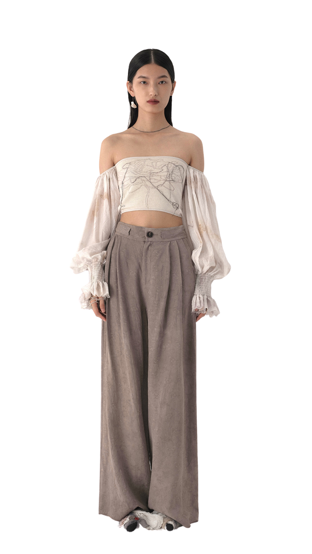 Crafted with a blend of premium wool and cashmere fabric, and complemented with mulberry silk fabric, this top features French handmade pleated cuffs and natural leaf dyed silk organza. The use of high-temperature setting pleats provides the top with a unique texture, while the knit jacquard with handmade embroidery adds a touch of elegance. The top is designed to provide a comfortable fit while maintaining its unique appearance.