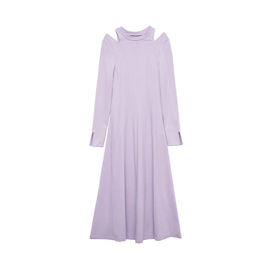 Long dress with a round neck, multiple split seams throughout the body, hollowed out shoulders, large A-line hem, and slit cuffs