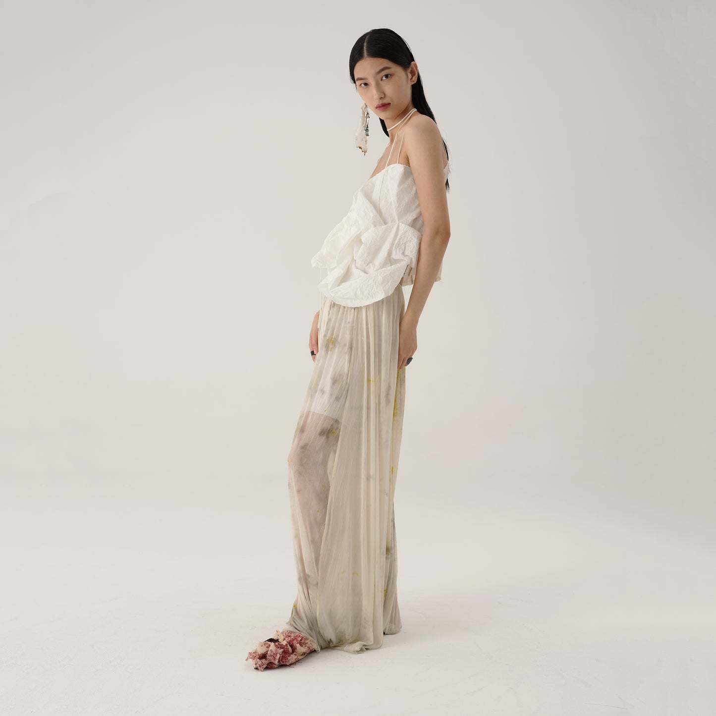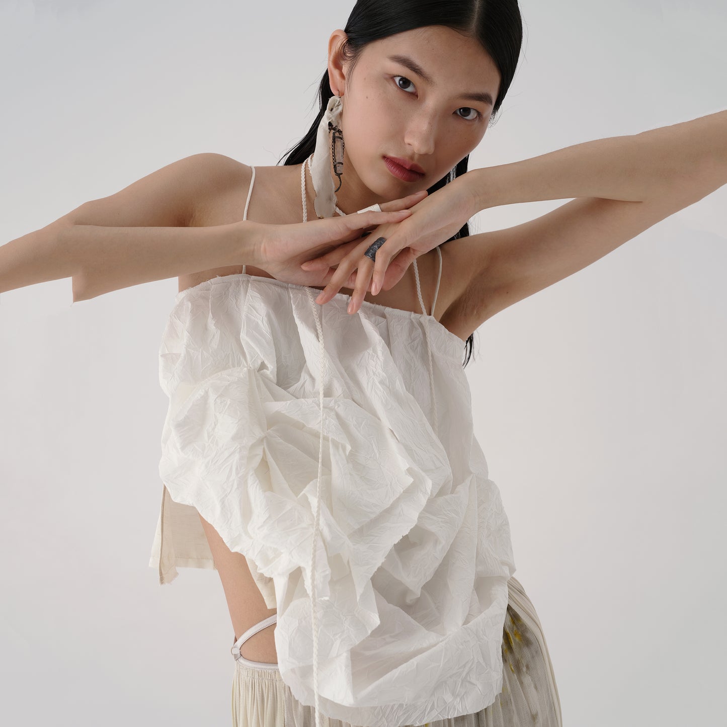 This camisole top features a sculpting fabric that flatters the figure, with a delicate hand-crafted flower accent on the bust. The main material is a blend of cotton and mulberry silk, while the trim is made of cotton and polyester fiber. The unique blue-green color of the top is inspired by the drapes of a cage, adding a touch of elegance to any outfit.