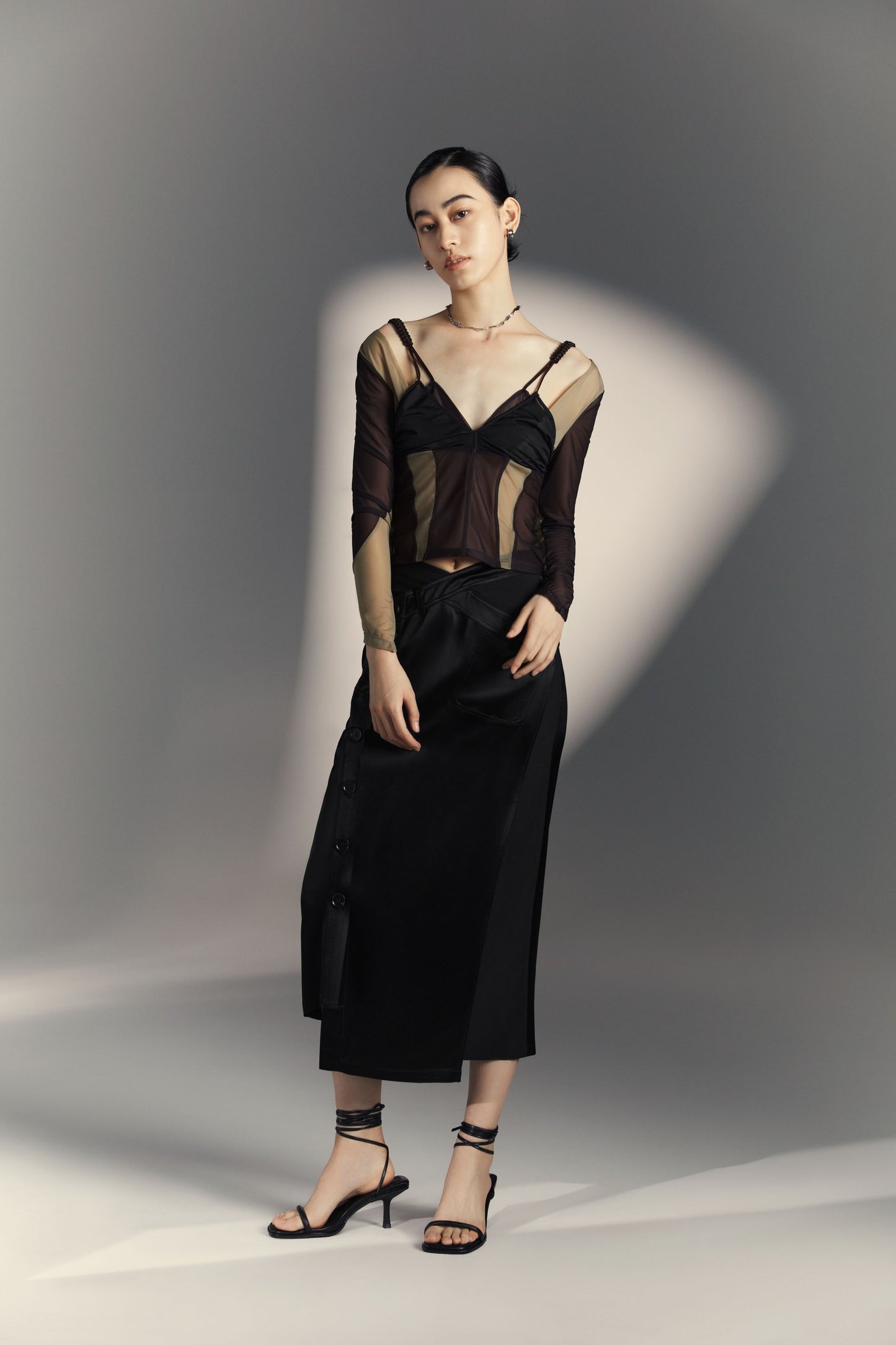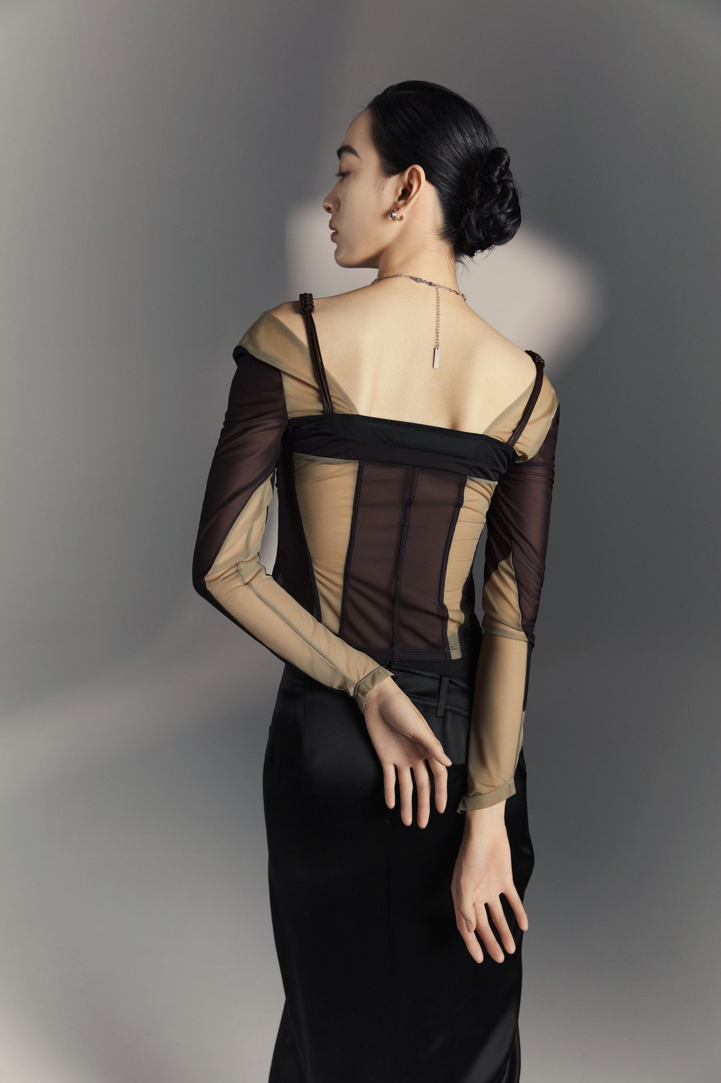 The tri-colored mesh fabric embodies the multiple forms of shadow, and this top shows infinite possibilities like the moment light goes through shadow. The special split design with the hidden mesh is like an infinite extension of the shadow. The woven shoulder straps are incorporated into the dress to make it look more three-dimensional.
